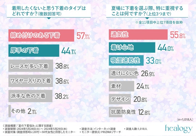 株式会社healogy(本社所在地:東京都千代田区、代表取締役:村井 麻衣)は、全国の20代〜50代女性を対象に、「夏の下着の悩み」に関する調査を実施しました。