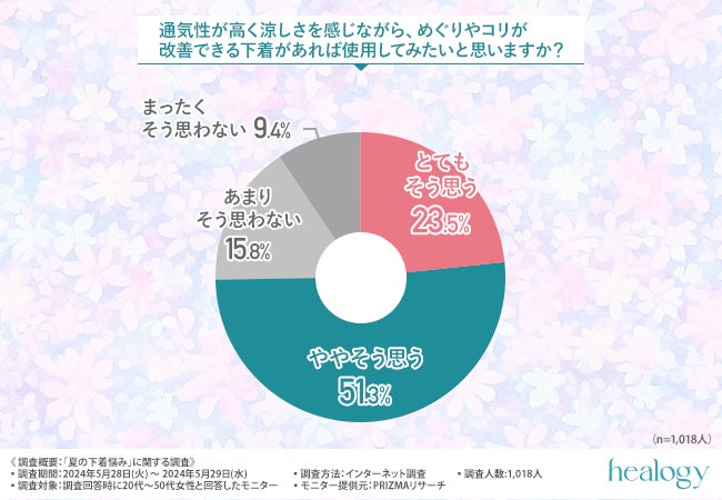 最後に「通気性が高く涼しさを感じながら、めぐりやコリが改善できる下着があれば使用してみたいと思いますか?」と質問したところ、『とてもそう思う(23.5%)』『ややそう思う(51.3%)』『あまりそう思わない(15.8%)』『まったくそう思わない(9.4%)』という回答結果になりました。