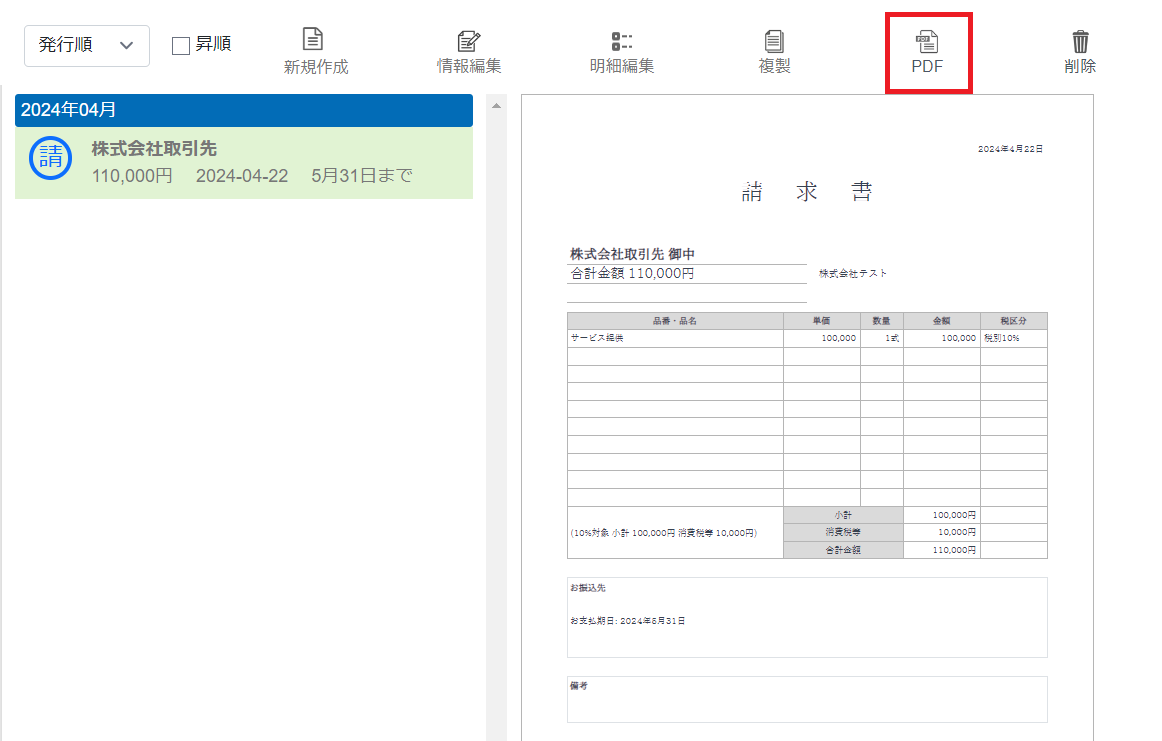 作成した書類を1クリックでPDFとして出力できます。