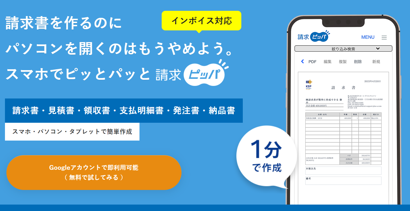 「請求ピッパ」は「インボイス」「電子帳簿保存法」「源泉徴収の計算」に対応し、スマートフォンからでも簡単に請求書を作成できるサービスです。パソコンやタブレットのみならず、スマートフォンから操作しやすいユーザインタフェースを採用し、利便性の高さを追求しました。クラウドサービスであり、どこからでもアクセスおよび請求書の作成が可能です。また、スマートフォンでも取引先へ請求書をPDF形式で送付できます。