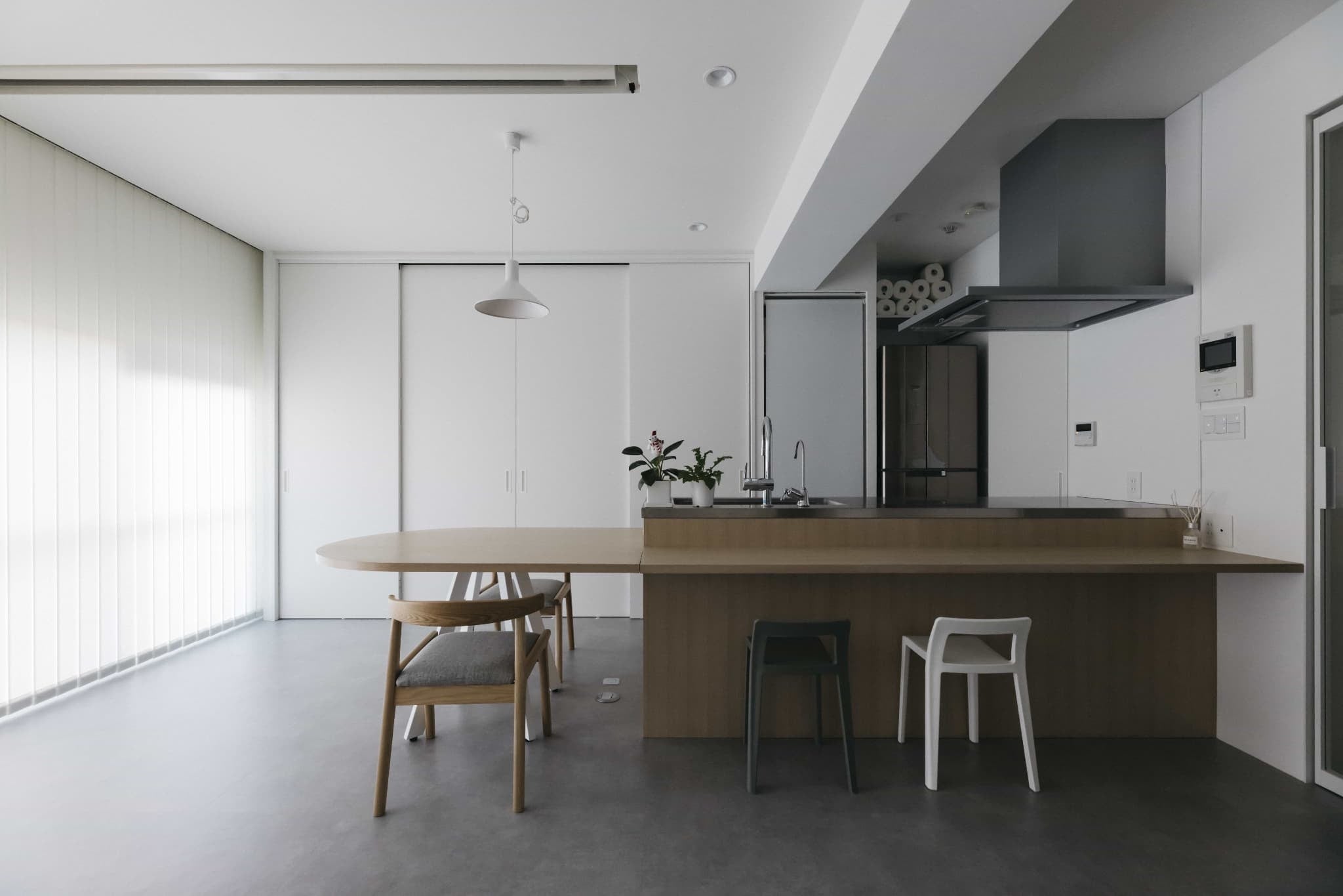 ✔ 白×モルタルで無機質なデザインに木目調の造作家具で温かみをプラス