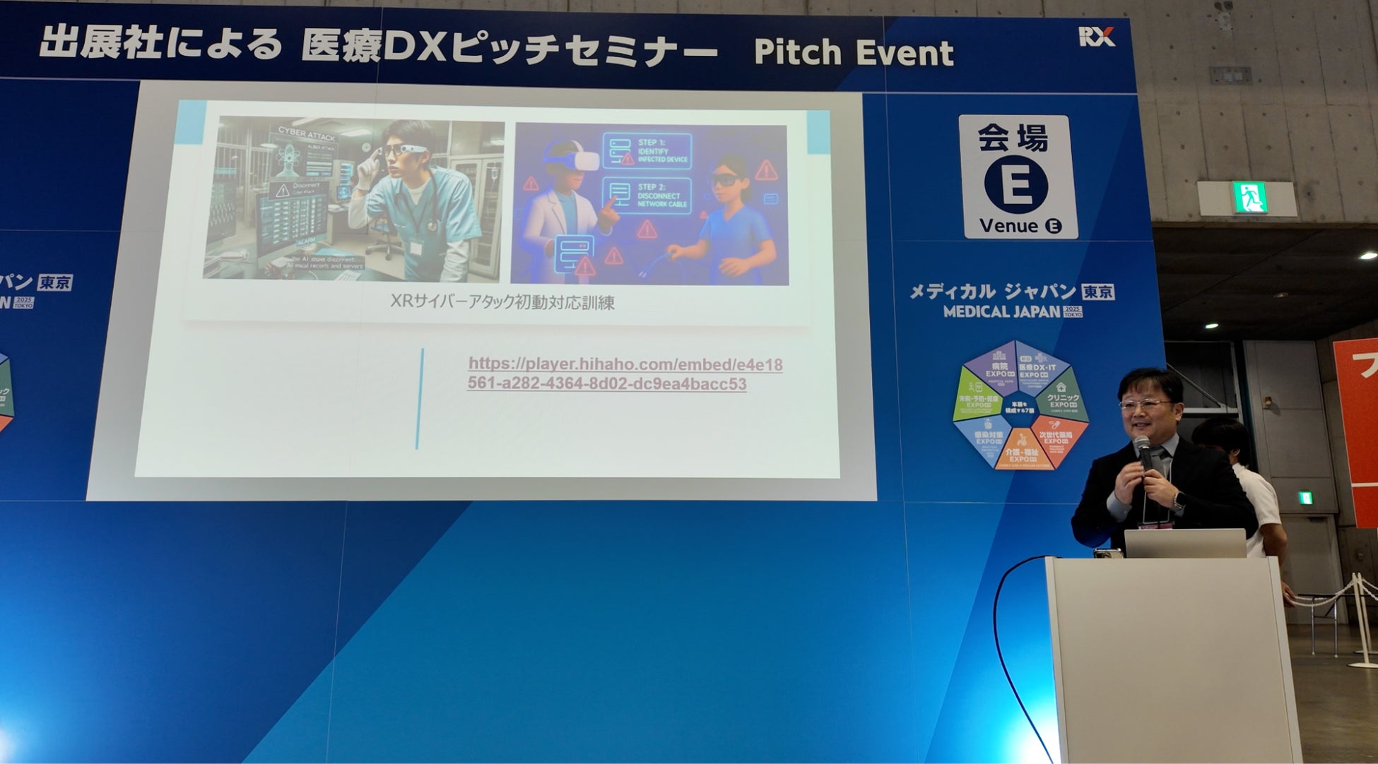 10月2日には、東京工科大学の田仲浩平先生が「医療者DXの最前線:XR・AI融合が拓く効率と安全性の両立」と題し講演を行い、医療機関がサイバー攻撃の標的となる現状や、被害事例・対応策、そしてVRを教育に活用する意義について解説されました。展示と講演が連動することで、知識と体験の双方から医療現場の意識向上を促すことができたと感じています。