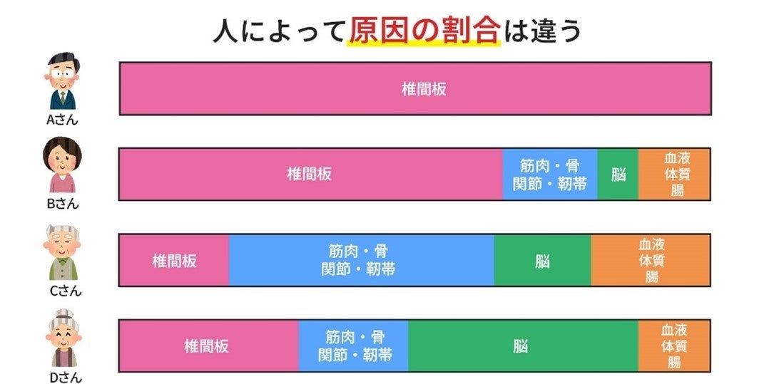 腰痛の要因はたくさんあり、その1つ1つの要因の強さは人それぞれ千差万別です。セルゲル法やフローレンス法は確かに腰痛の主要因である椎間板や脊柱管に対する治療のため高い効果が見込まれますが、人によっては椎間板や脊柱管以外の要素が強い方もいらっしゃいます。