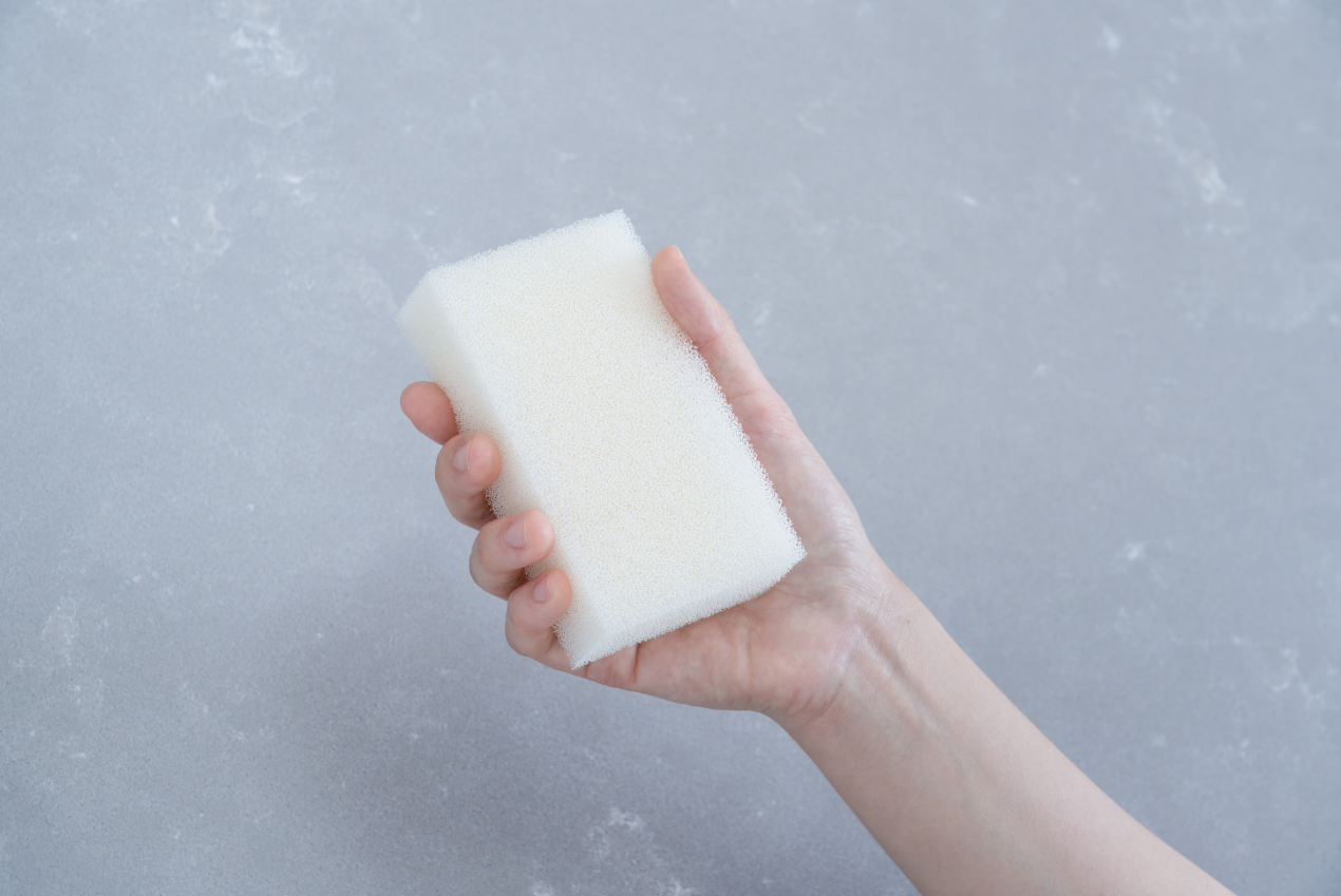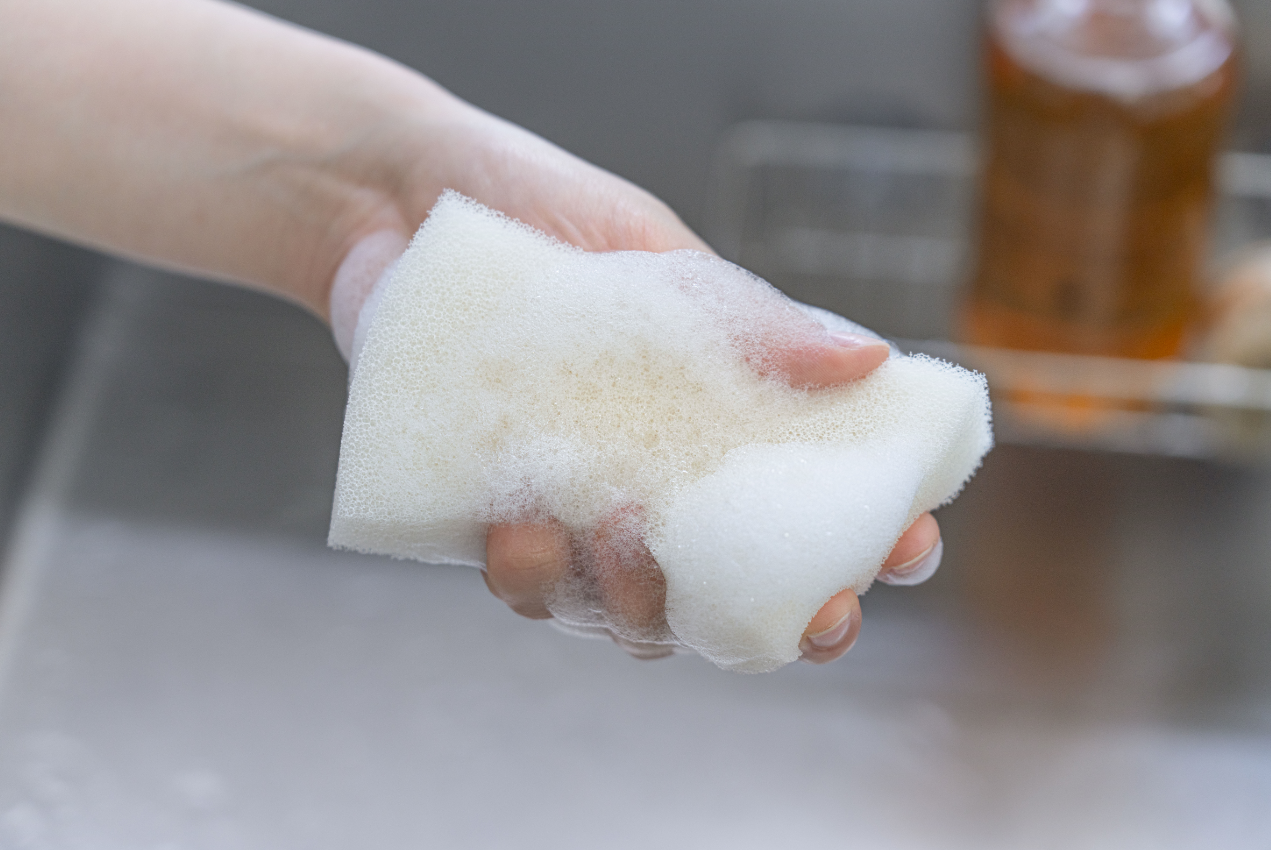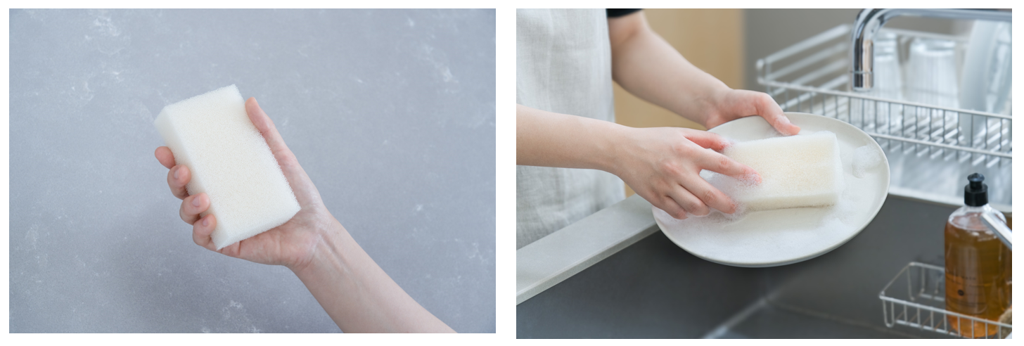 およそ70年(※)のウレタン製造技術を活かし、植物性素材でありながら、石油由来製品と同等の使用感を実現しました。ウレタンの目が細かいため繊細な泡を作り出すことができ、食器や調理器具をすっきりと洗い上げます。また、抗菌剤を配合していることに加え、水や空気の通り道を邪魔する膜を除膜加工で取り除くことで高い通気性を実現し、スポンジ自体の清潔も保ちます。一般的な石油由来のスポンジと同じように使用できるため、本製品を普段の食器洗い時に使用するだけで、無理なく環境に配慮した生活を送ることができます。