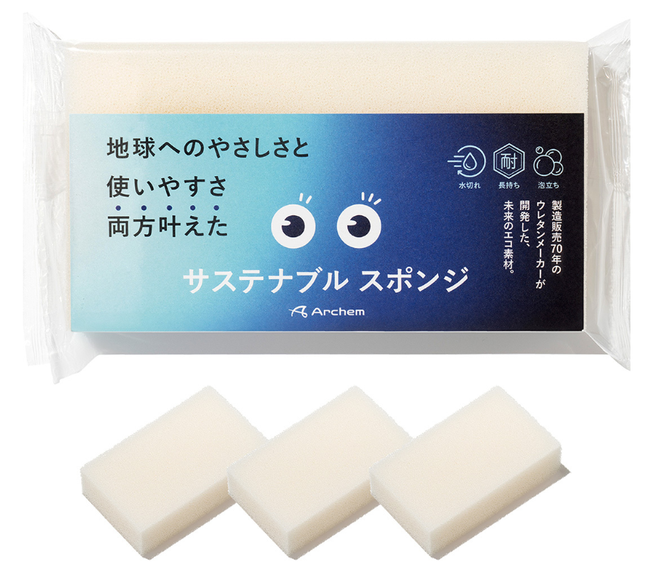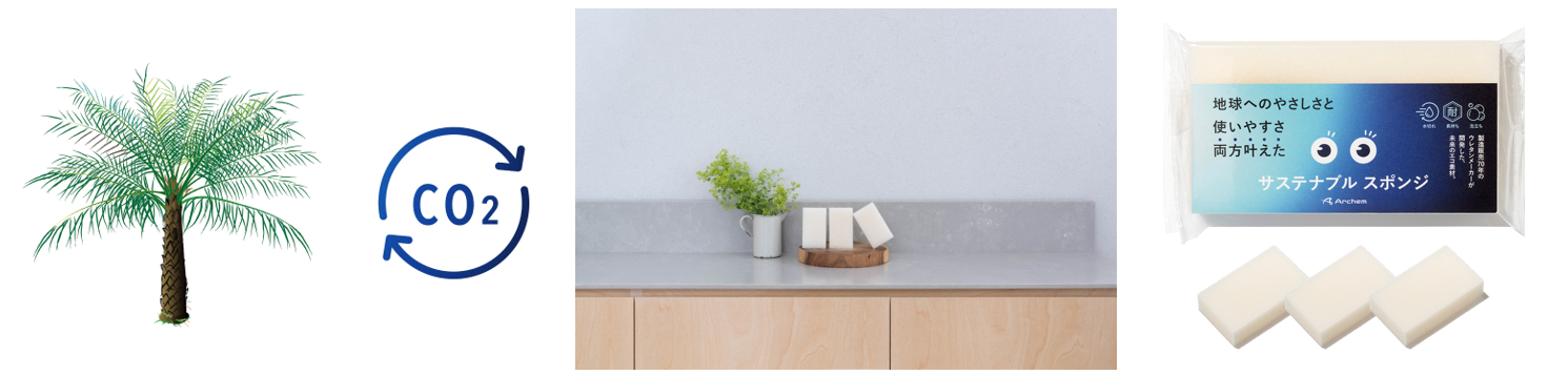 今回発売する「サステナブル スポンジ」は、当社初となるヤシ由来の植物性素材を採用しています。世の中に植物由来の工業製品が少ない中、製造時にヤシ由来のポリオールを配合することで、製造から焼却時の実質的なCO2排出量を削減し、カーボンニュートラル社会に貢献します。通常のキッチンスポンジと同等の泡立ちや通気性のため、本製品を普段の食器洗い時に使用するだけで、無理なく環境に配慮した生活を送ることができます。