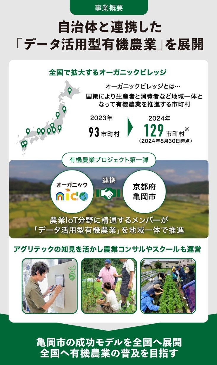 「日本の有機農業シェア25%に向けて邁進する」という意味を込めて、社名を「オーガニックnico」と名付け、有機農業を中心に「有機野菜事業(栽培と販売)」と「アグリサイエンス事業(農業コンサルティング)」の2つの事業を行い「データ活用型有機農業」を確立し、有機農業の普及を目指しています。
