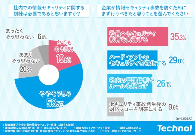 「社内での情報セキュリティに関する訓練は必要であると思いますか?」と質問したところ、『とてもそう思う(19.6%)』『ややそう思う(53.5%)』という回答が寄せられました