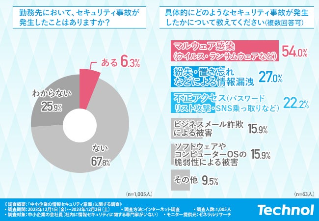 「勤務先において、セキュリティ事故が発生したことはありますか」と質問したところ、『ある(6.3%)』と回答しました。