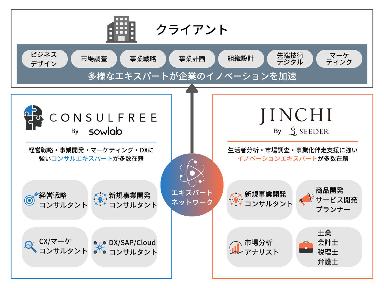 SEEDERがもつ独自の未来動向データベースの活用に長けたイノベーション支援人材のマッチングサービス「JINCHI(ジンチ)」と、SowLabが提供するコンサル人材特化型フリーランス検索サービス「CONSULFREE(コンサルフリー)」が融合し、クライアントの経営戦略・事業開発・マーケティング課題を戦略提案から実務支援まで多様なエキスパート人材の力により解決いたします。