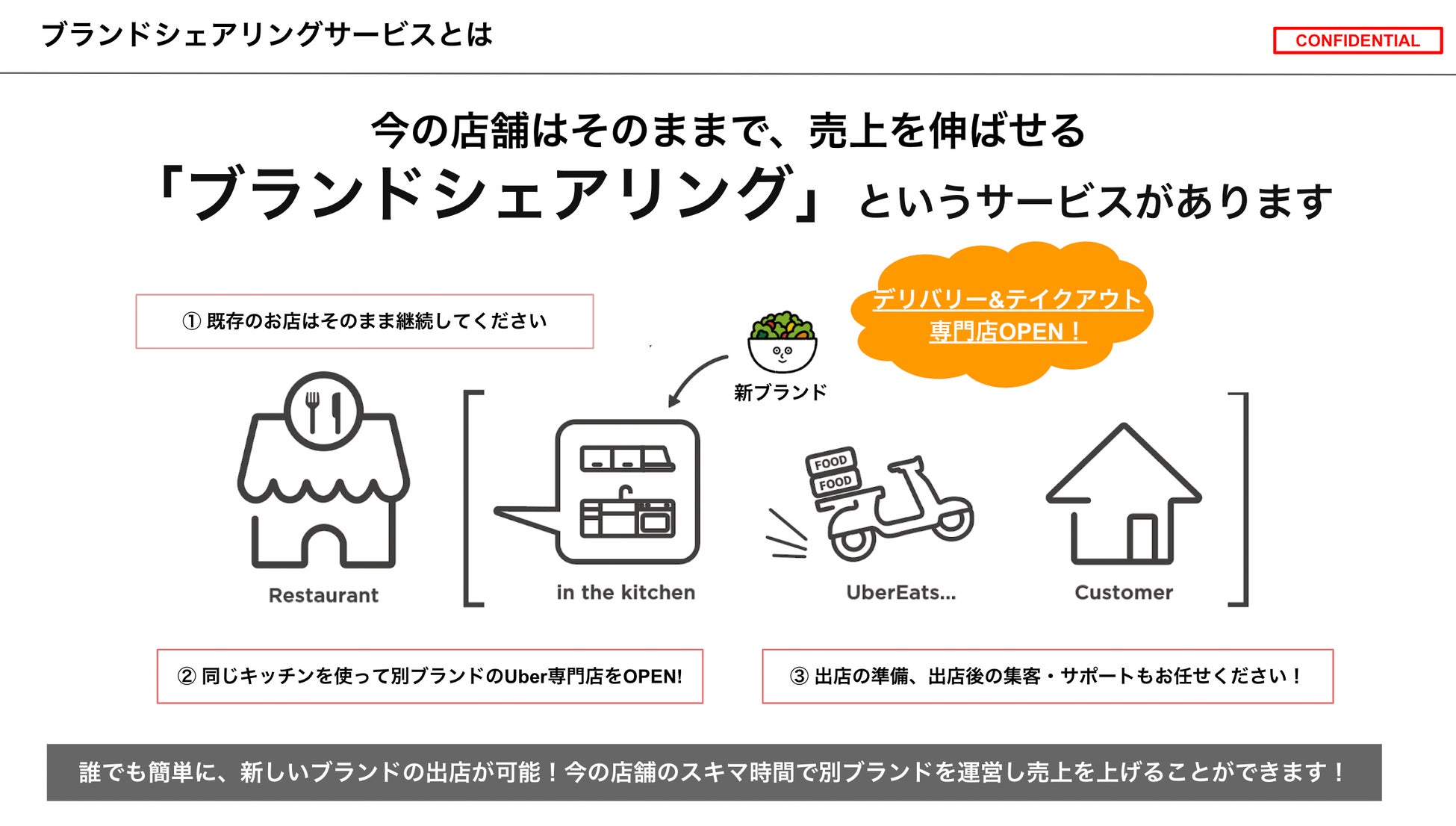 今の店舗はそのまま運営をしながら、Uber Eatsや出前館などのデリバリーサービスを活用し、新たなブランドを運営することで、売上を最大化させていく飲食店の新しいビジネスモデルです。