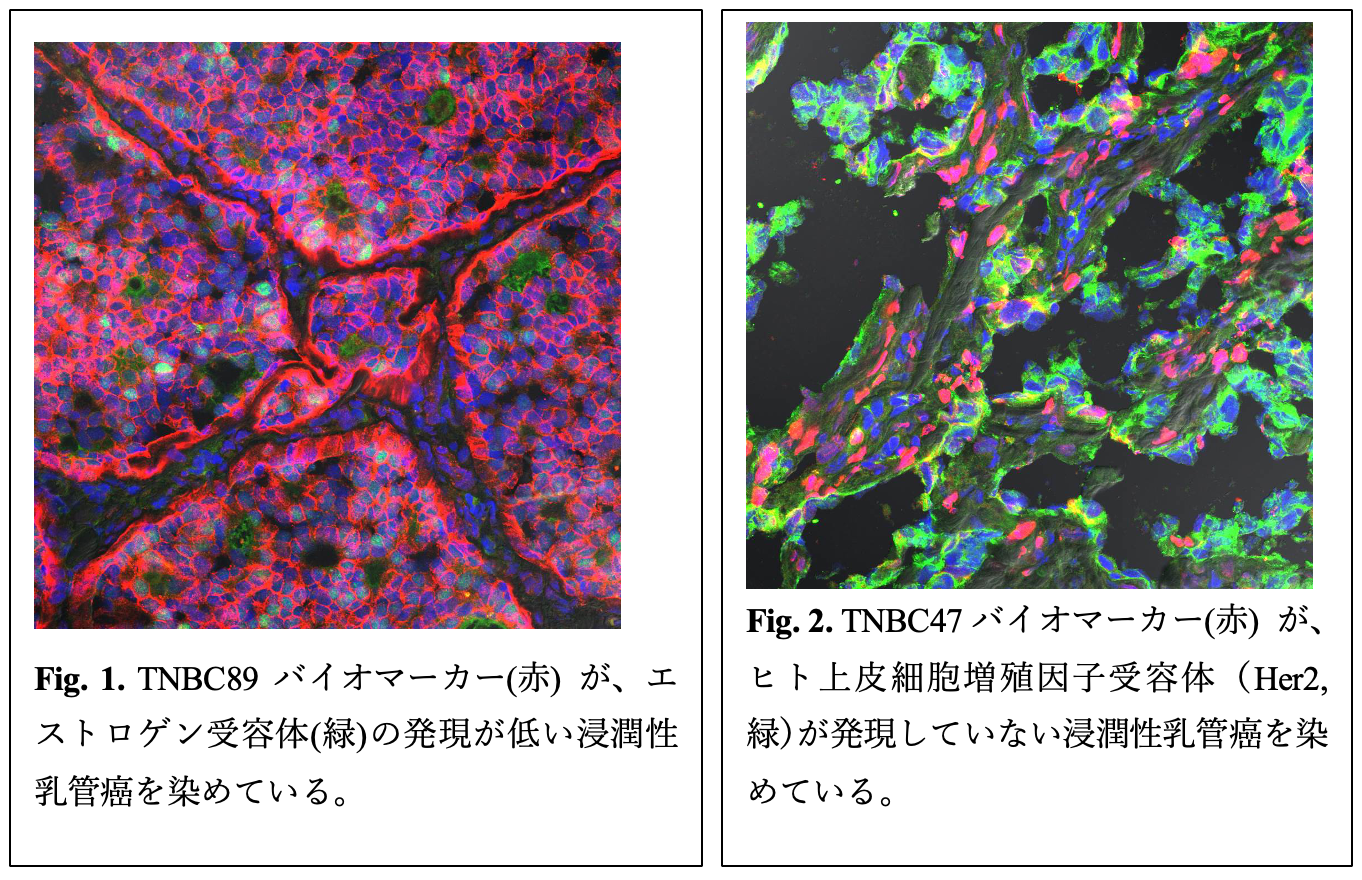 Fig. 2. TNBC47バイオマーカー(赤) が、ヒト上皮細胞増殖因子受容体(Her2, 緑)が発現していない浸潤性乳管癌を染めている。