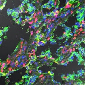 Fig. 1. TNBC89バイオマーカー(赤) が、エストロゲン受容体(緑)の発現が低い浸潤性乳管癌を染めている。