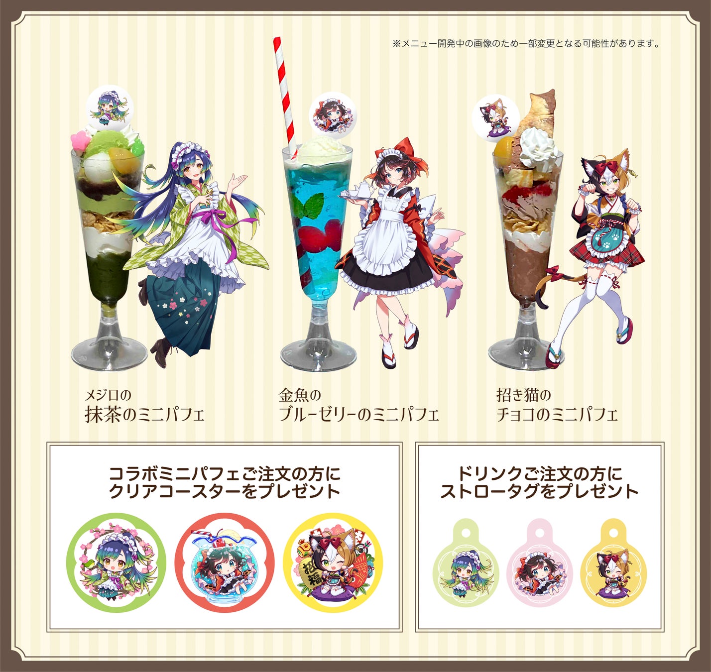本展ではコラボカフェのための描きおろしキャラクターの登場とミニパフェとのコラボが楽しめます。また京都での開催にちなみ「和」をモチーフにした展示、グッズ販売もします。