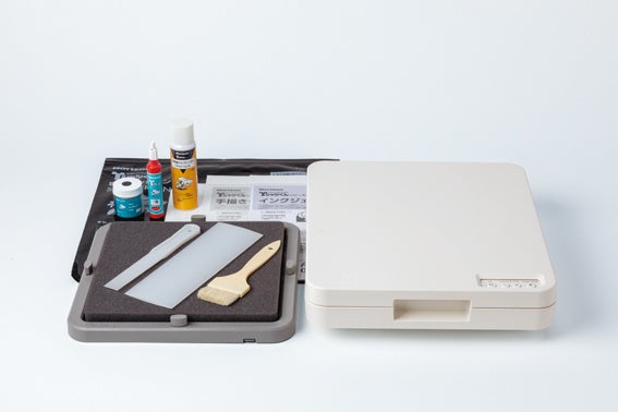 露光機:1台、インク黒:50g×1、専用フレーム:×1、ペン型インク赤:×1、スクリーン(版):×3枚m、スキージ、ハケ、ヘラ、マット、印刷パネル、スプレーのり、専用用紙(2種)