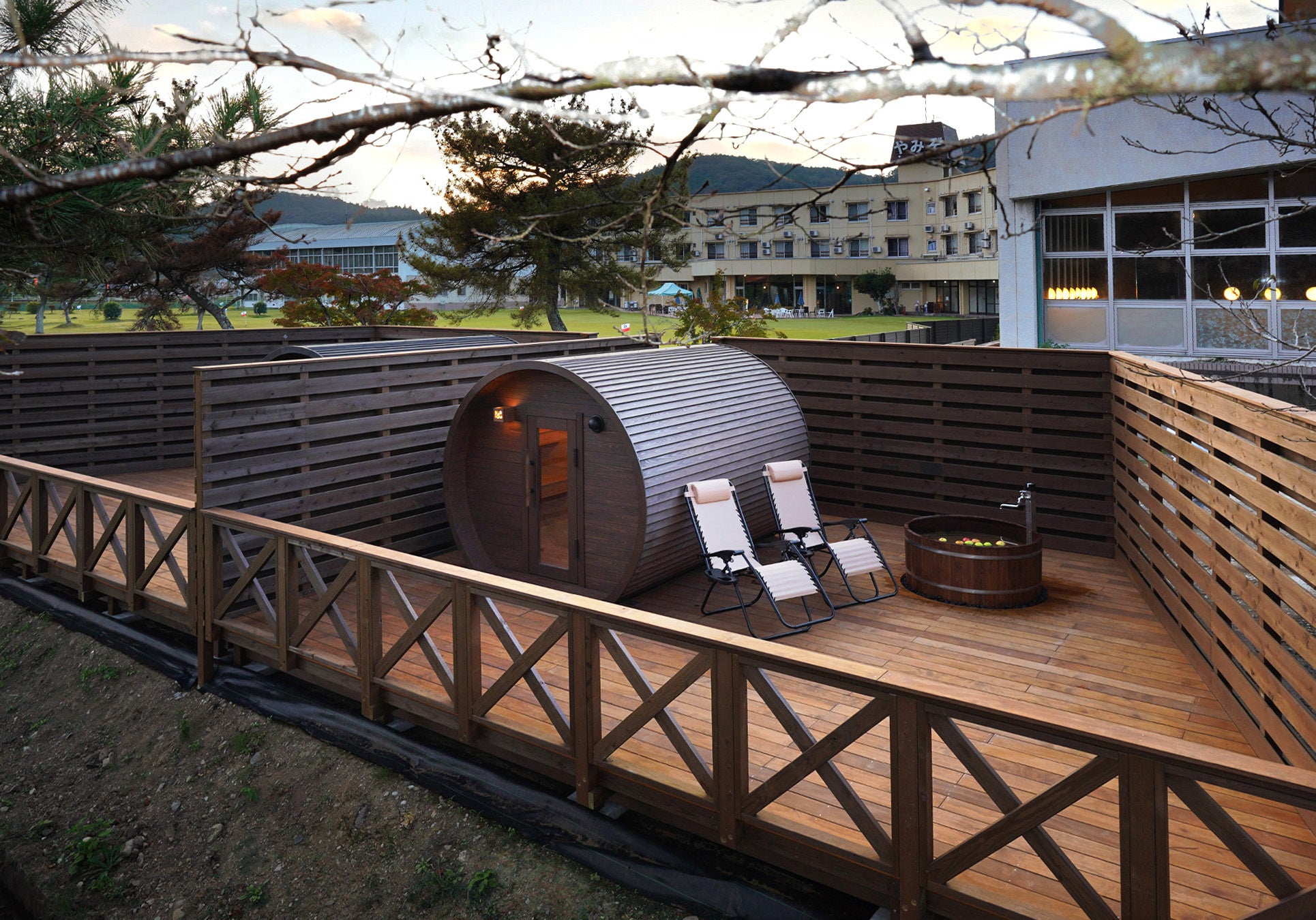 日帰り温泉も楽しめるやみぞホテルに設置された2台のバレルサウナは、貸切制のプライベートサウナとして宿泊者はもちろん、日帰り温泉のお客様もご利用することができます。