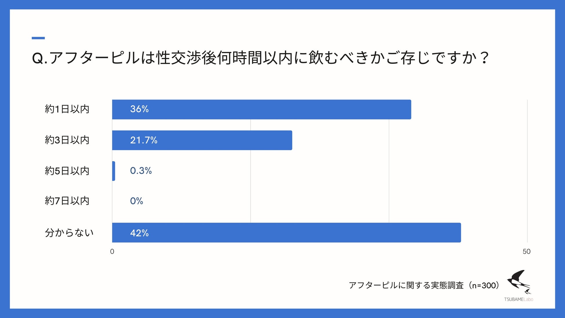 今回の調査では、アフターピルの認知度が我々の想像以上に高いことが明らかになりました。一方、アフターピルの推奨服用時間について40%以上が分からないと回答し、その他の回答ではアフターの推奨服用時間として57.7%が約3日以内と回答、約5日以内と回答した方は全体の約0.3%という結果になりました。現在日本で最も普及率の高いアフターピルは性交渉後72時間(3日以内)の服用期限とされています。しかし、海外で普及しているアフターピルでは性交渉後の服用期間が120時間(5日以内)まで対応可能なものもあり、日本でも医療機関を受診するタイミングによっては海外製のアフターピルを処方されるケースも増加しています。