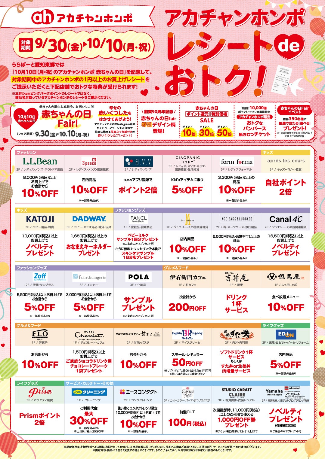 | キャンペーン「アカチャンホンポ レシート de おトク!」の他、「赤ちゃんの日 Fair!」を開催。 開催期間:2022年9月30日(金)~10月10日(月・祝) 詳しくは下記サイトよりご確認ください。 URL: https://mitsui-shopping-park.com/lalaport/togo/cp/pdf/2209akahon_receipt_cp.pdf |