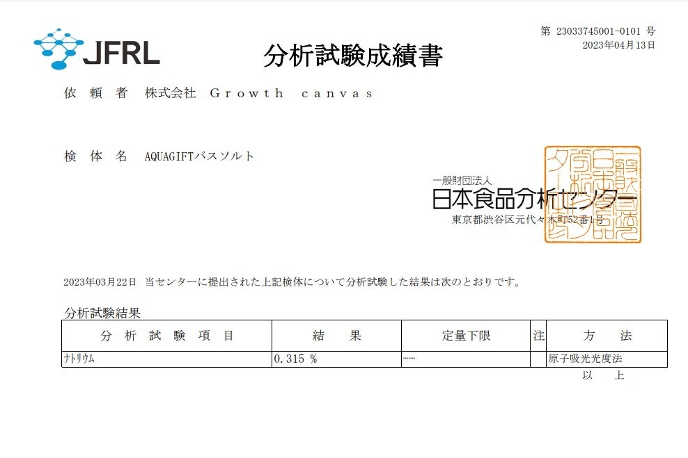 しかし一部お客様より頂いた声の中で、商品を使用したことでサビの原因になるのではと不安なお声があり、 「AQUAGIFT(アクアギフト)」バスソルトを利用される方へ、品質を疑うことなくご納得頂いた上で購入して頂きたいと思い、外部分析機関である、一般財団法人日本食品分析センター様にて検査をお願い致しました。