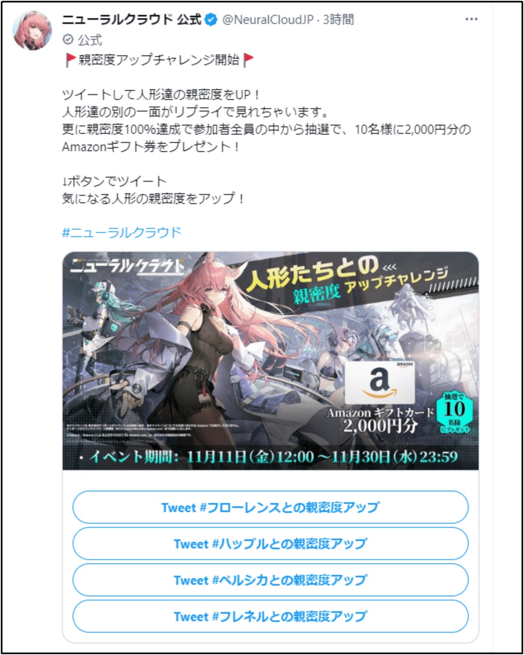 111月11日(金)より、TwitterにてAmazonギフト券が当たる【人形たちとの親密度アップチャレンジ】を開始しました。こちらは対象ツイートに表示されるキャラクターに対応したボタンを押すことで、親密度をUPできるシステムです。