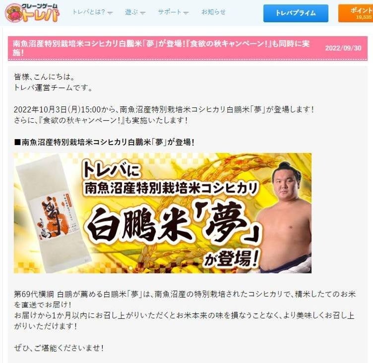 ※今後も色々なオンラインUFOキャッチャーに登場予定!白鵬米夢をゲットしてください。