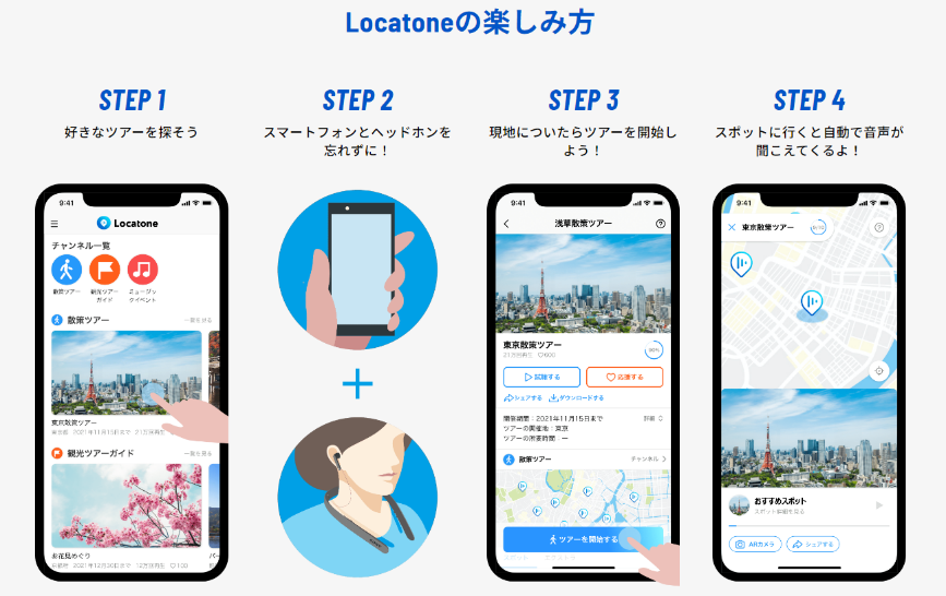 Locatone(ロケトーン)は、ソニーが開発したSound AR™(現実世界に仮想世界の音が混ざり合う新感覚の音響体験)を楽しむためのアプリです。ツアーを開始し、マップ上にある特定のスポットを訪れると、位置情報に連動して自動的に音声や音楽が聞こえてきます。音を聴きながら街をめぐることで、街の新しい魅力や楽しみ方を発見することができます。