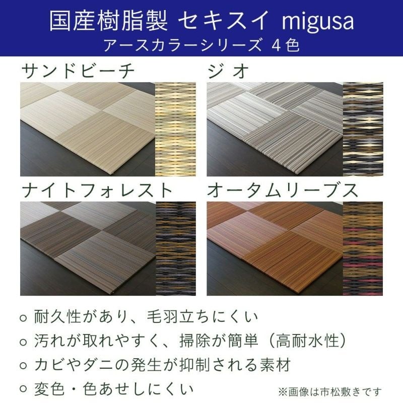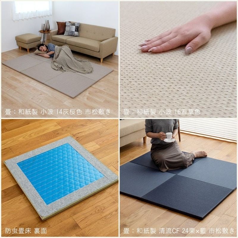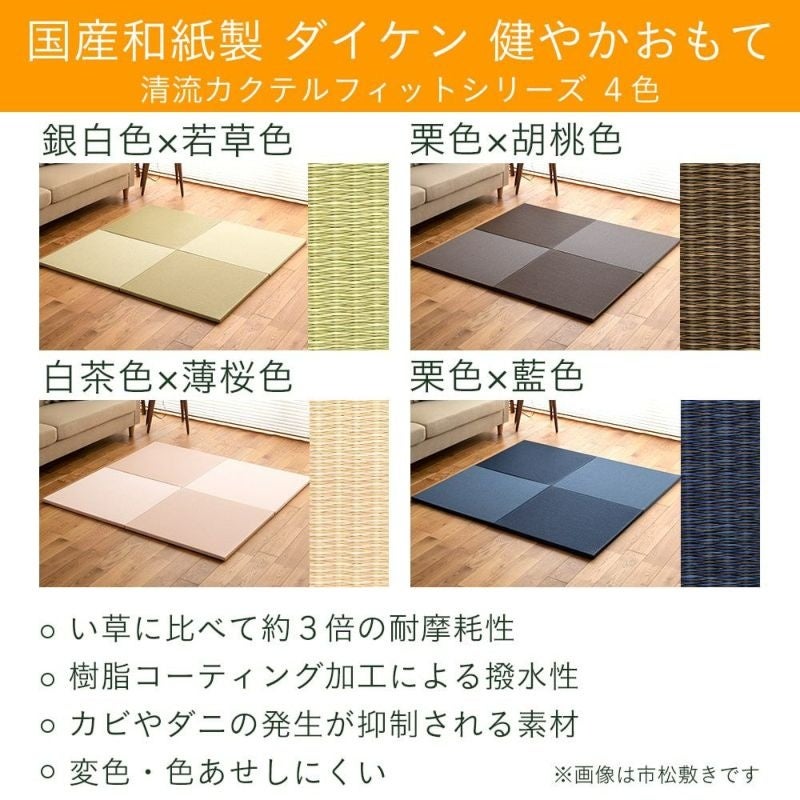 特に置き畳としては珍しい国産和紙製ダイケン健やかおもての清流カクテルフィット4色、穂波シリーズ3色、小波シリーズ3色をラインナップしています。