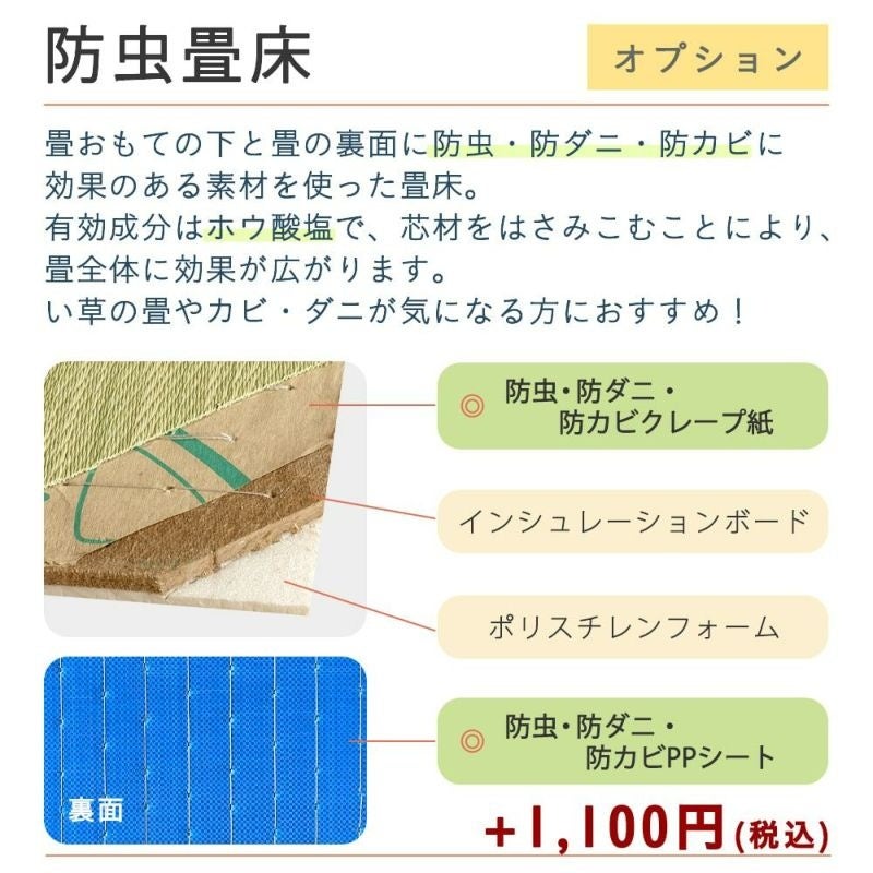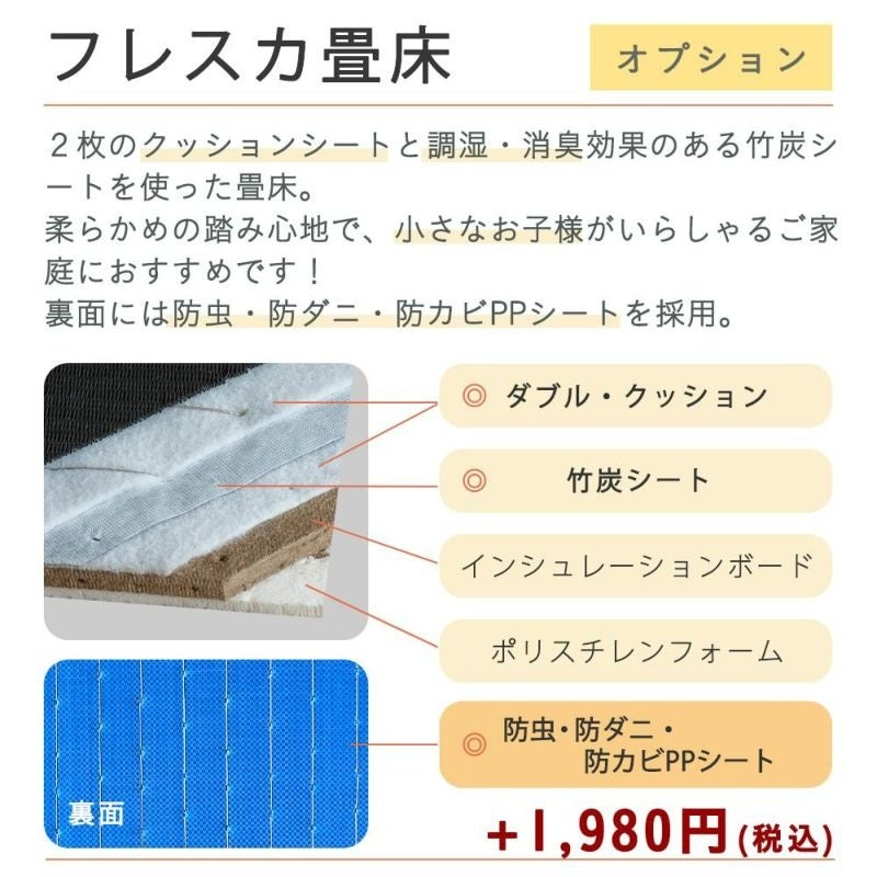 標準的な畳床、防虫・防ダニに特化した防虫畳床、クッション性や調湿など機能性に優れたフレスカ畳床の3種類の芯材・畳床から選択が可能です。20mm以下は専用の薄畳のみとなります。