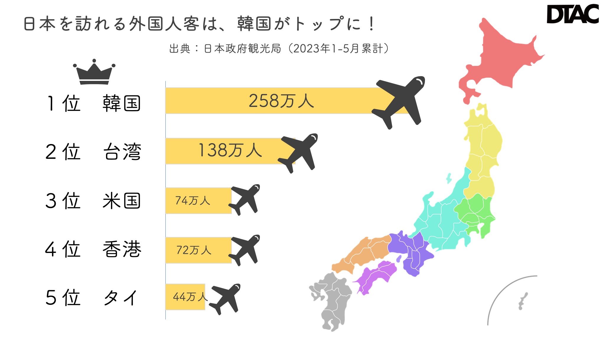 韓国からの2023年4月時(最新)の訪日人数は、前年同月比60.6倍の46万7,000人となっており、最多となっております。1-5月では258万人とダントツNa,1 *日本政府観光局(JNTO) 5月17日に発表