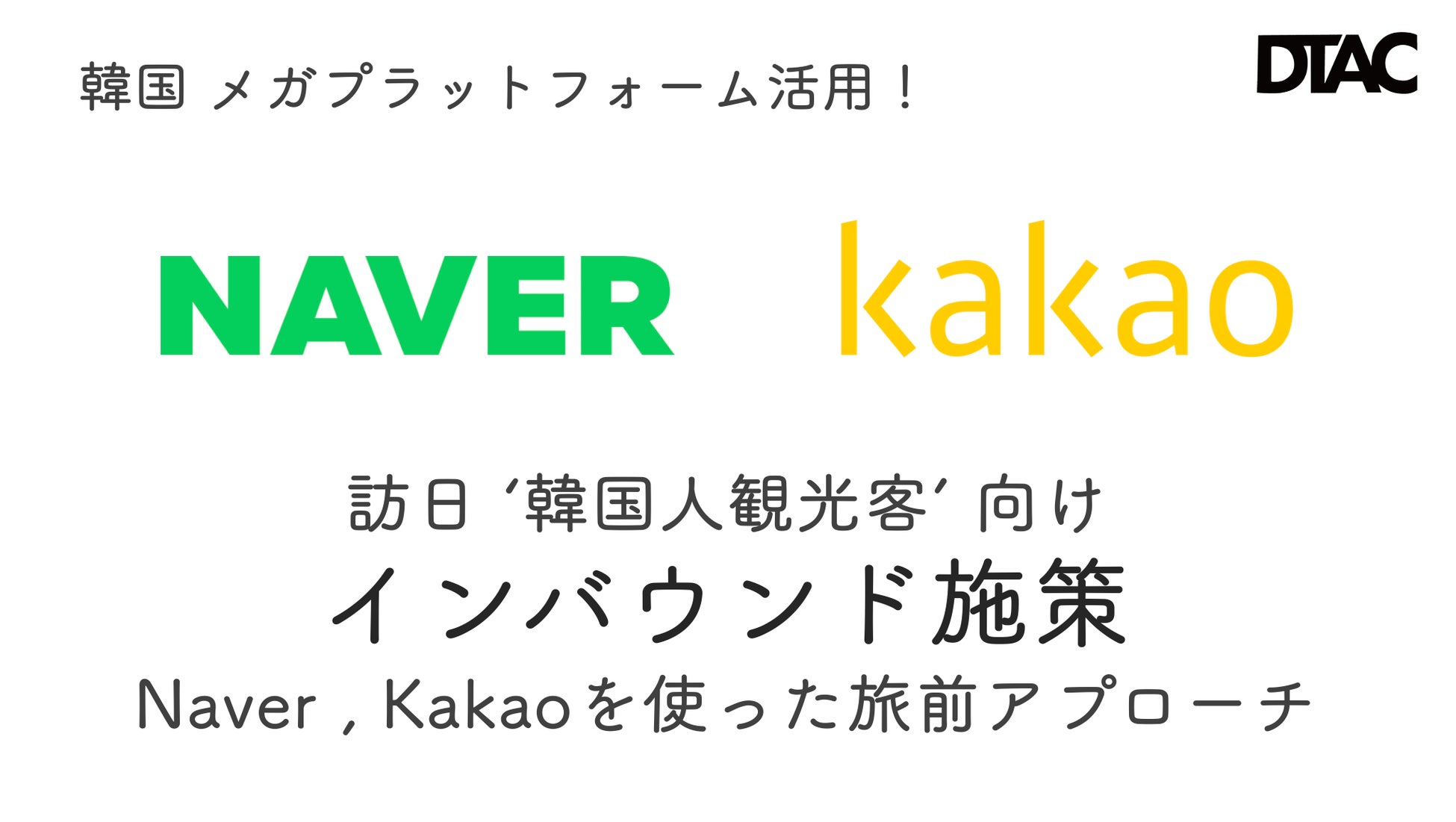 アジアを中心にデジタルマーケティングとリゾート&飲食事業で、新しい空の扉を開く株式会社DTAC(本社:東京都中央区 代表:髙橋大介 読み:ディーティエーシー)は、訪日韓国人観光客向けインバウンド施策で、韓国大手検索&ポータルサイトのNaver.comと韓国大手コミュニケーションメディアのKakao talkを組み合わせることで、韓国人観光客の生活導線にしっかりと、訪日の来場、来店情報を紹介できる2大メガプラットフォームパッケージをリリースいたしました。