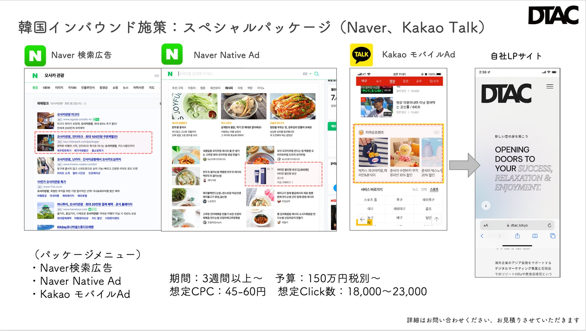 今回 DTACの韓国インバウンドパッケージは、NaverやKakaoなど複数のメガプラットフォームと提携することにより、訪日前のユーザーに、彼らの日常的に利用するインターネット上の生活導線しっかりと情報を紹介する機会を得ることで、効果的な来場・来店を実現させることができる。
