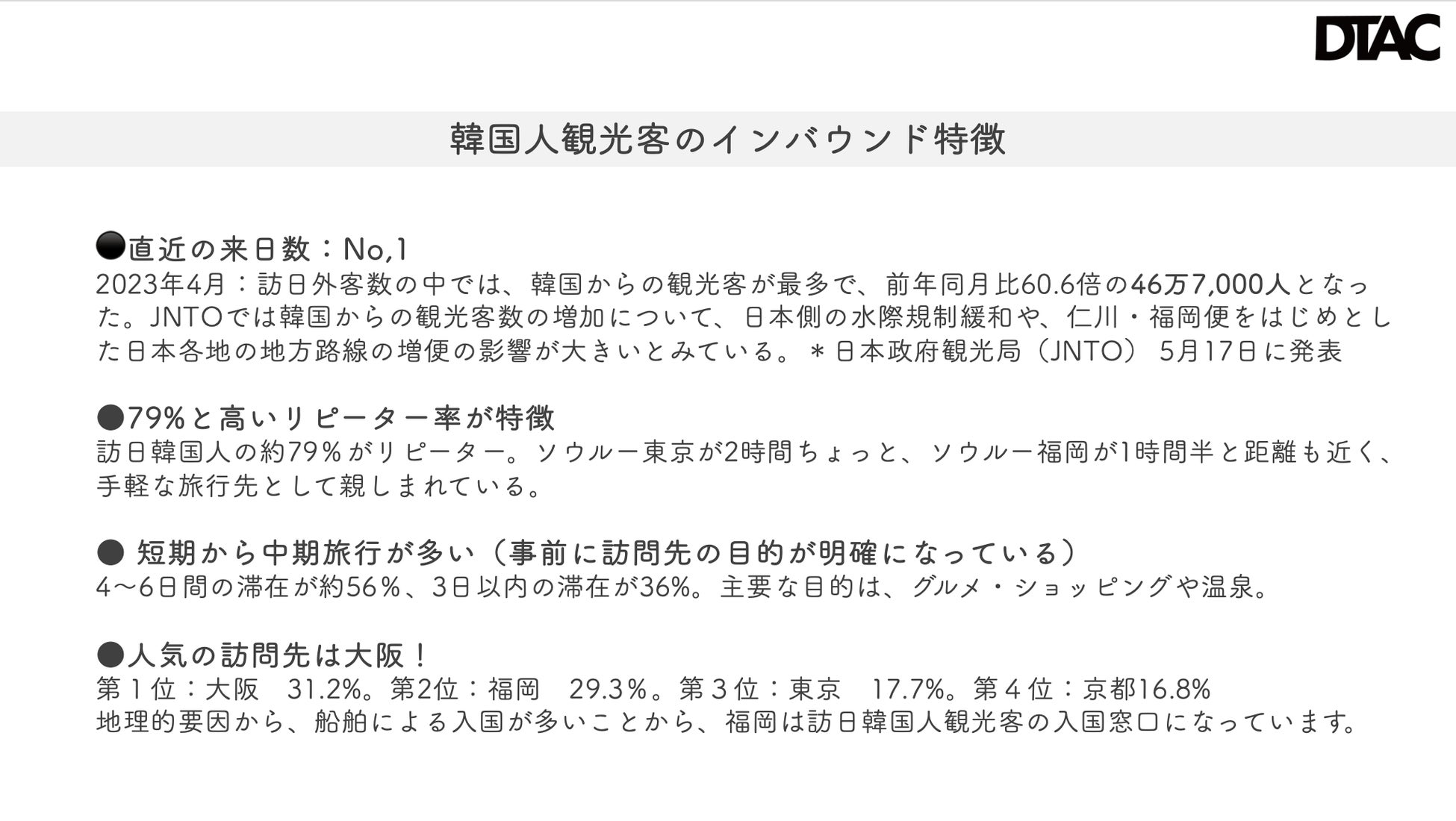 韓国人観光客のインバウンド特徴は、滞在期間が4〜6日間の旅行が約56%で、リピーターが多い。