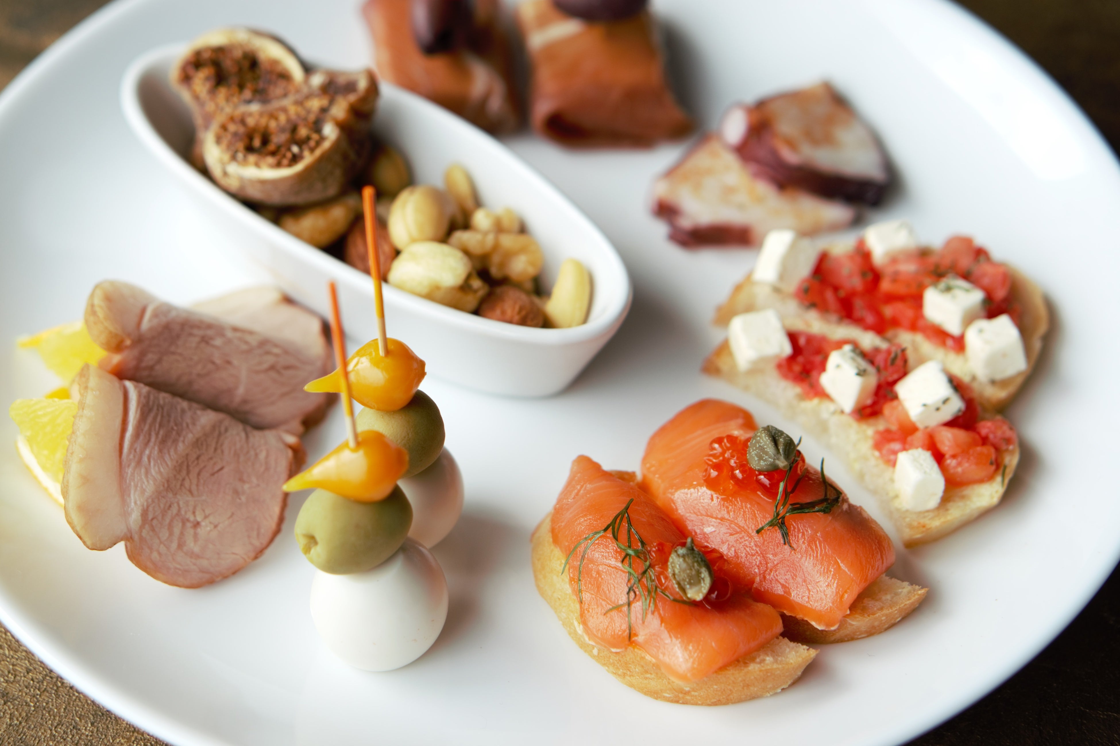 〈セイボリー〉鴨のスモークとオレンジ、うずら卵のピンチョス、生ハムのピンチョス、サーモンのカナッペ、トマトのブルスケッタ、タコのパプリカマリネ、ミックスナッツ・ドライいちじく