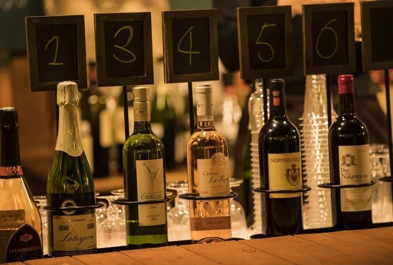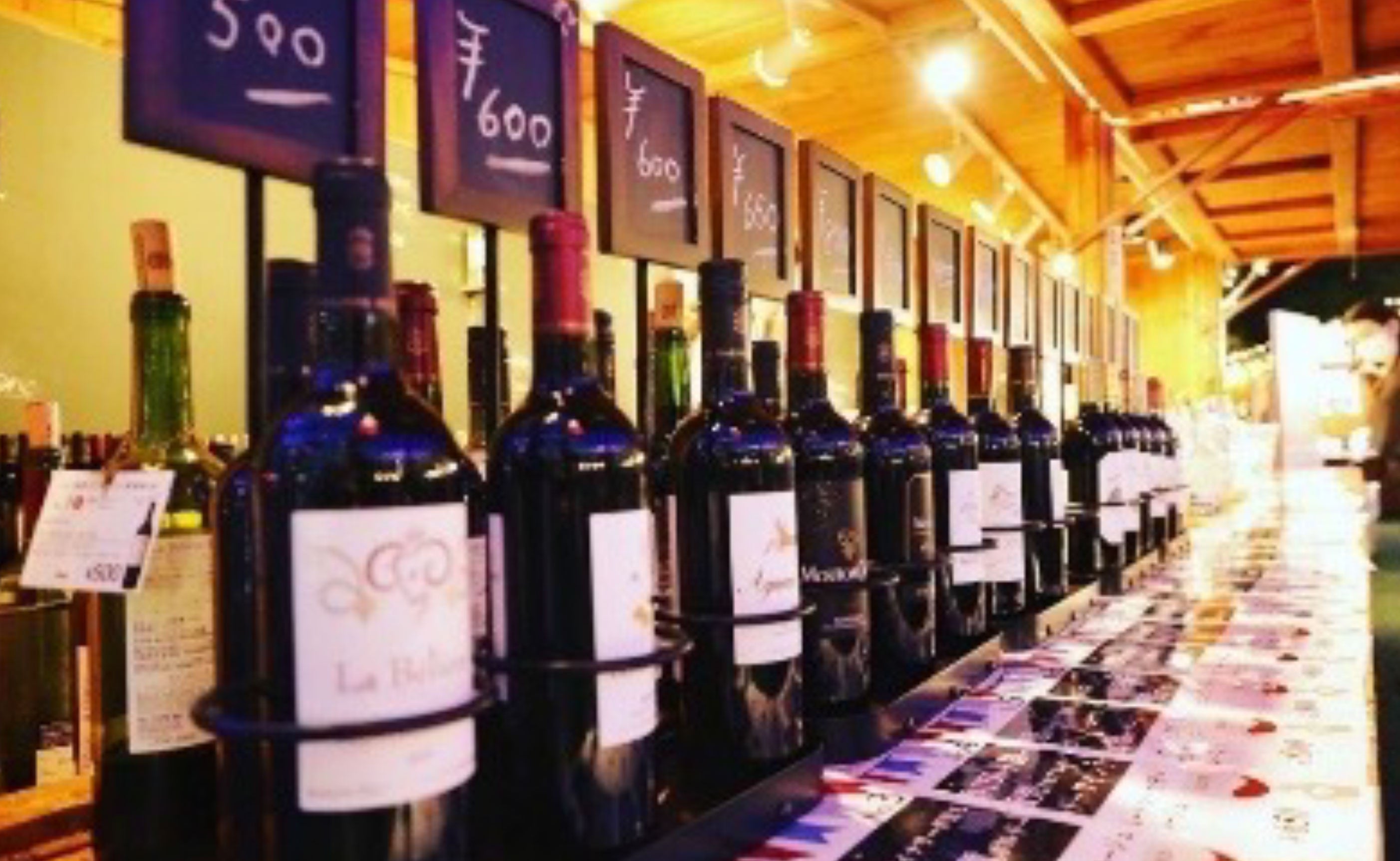 ワイン:100種類(ボルドー、ロワール、コート・デュ・ローヌ、ラングドック、プロヴァンス、ブルゴーニュ、シャンパーニュ、アルザスといった各産地の赤・白・ロゼ・オレンジ・スパークリング)