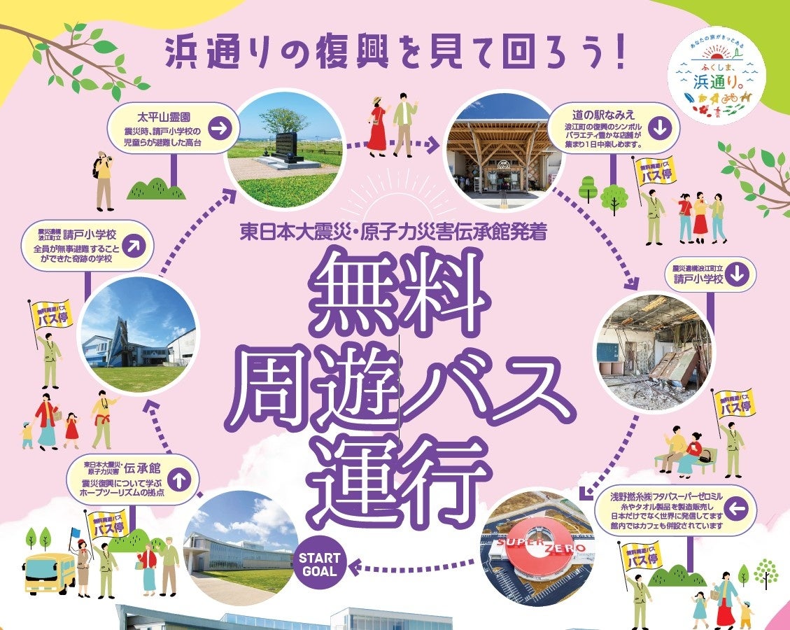 2023年7月15日(土)、8月11日(金・祝)の2日間、浜通り地域に来訪されるお客様のニーズの把握や周遊観光の促進に向け、震災遺構や復興関連の施設などを回る周遊バスを試験的に運行いたします。無料で利用でき、現地の説明ガイドも同乗しますので、是非この機会にご利用ください。