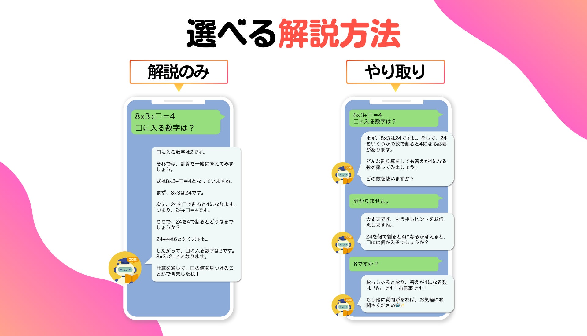 事前に設定した学年に応じて適切な言葉づかいや表現を調整します。また、解説方法は「すぐに解説」または「やり取りしながら」の2つから選択可能で、個別のニーズに合わせた学習スタイルで理解を深めることができます。※AIの性質上、設定通りに生成されない場合がございます。