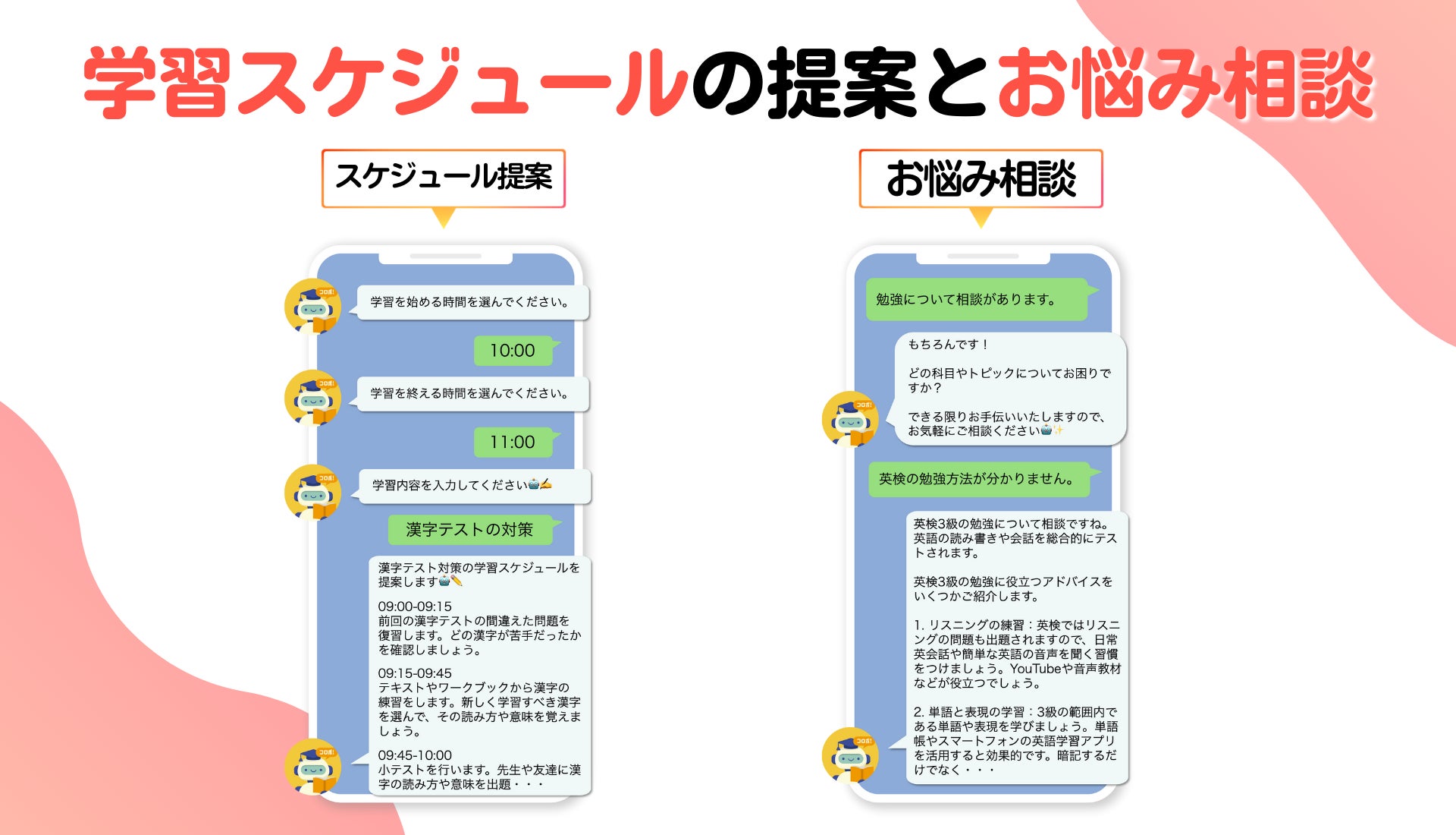 LINE内で会話をしながら勉強のサポートをしてもらえるため、個々の学習ニーズに合わせてより効果的な学習体験を実現いたします。