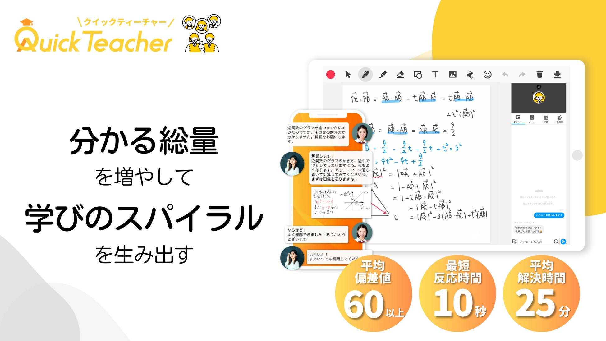 東大・京大・医学生などの講師陣 + AI先生*に24時間365日、チャットまたはオンライン通話で質問できるリアルタイム個別指導サービスです。「分かる総量を増やして学びのスパイラルを生み出す」というビジョンを掲げ、全国の学習塾を対象にサービスを提供しています。※AI先生への質問はチャットのみ対応しています。