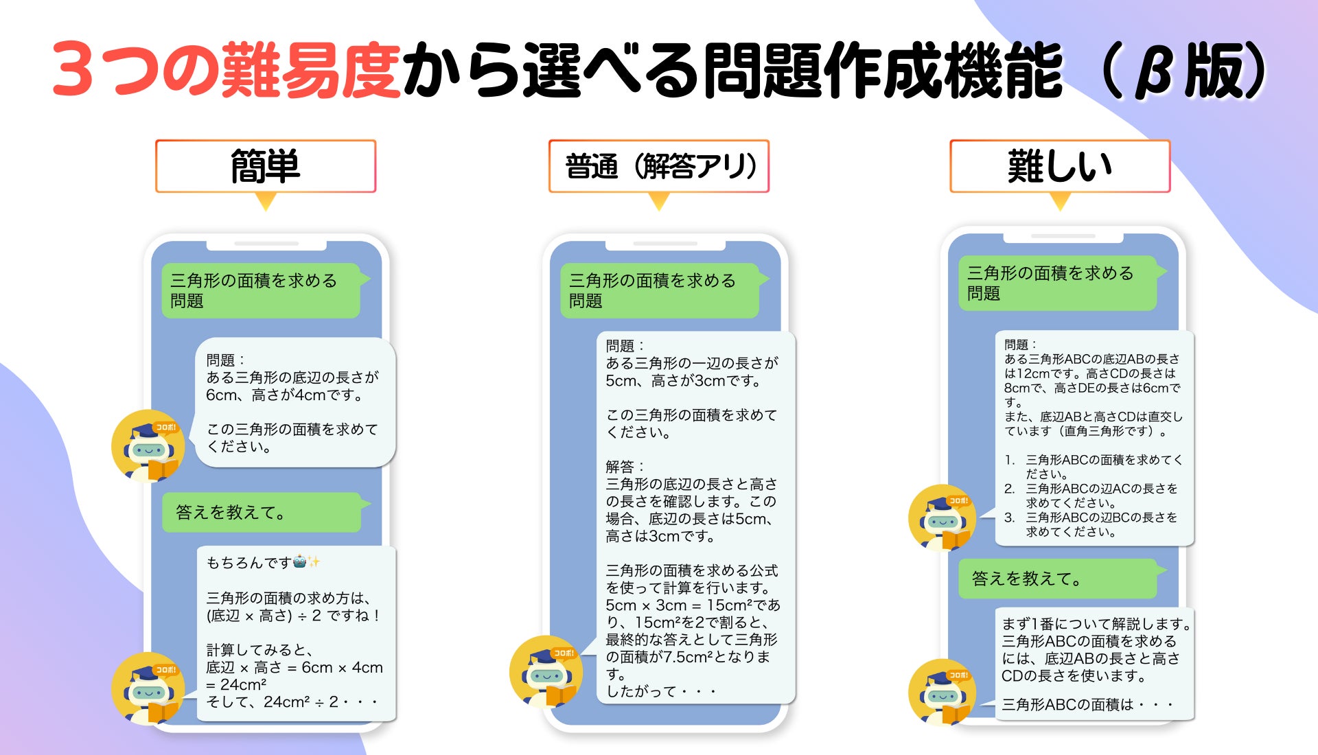 などなど、ただ問題の答えを聞くAIではなく、学習時のサポートに特化したAIコーチです。