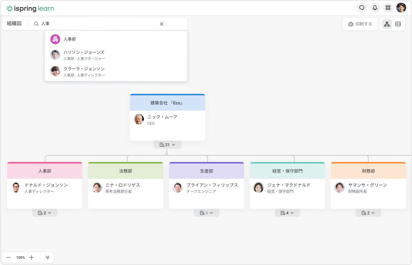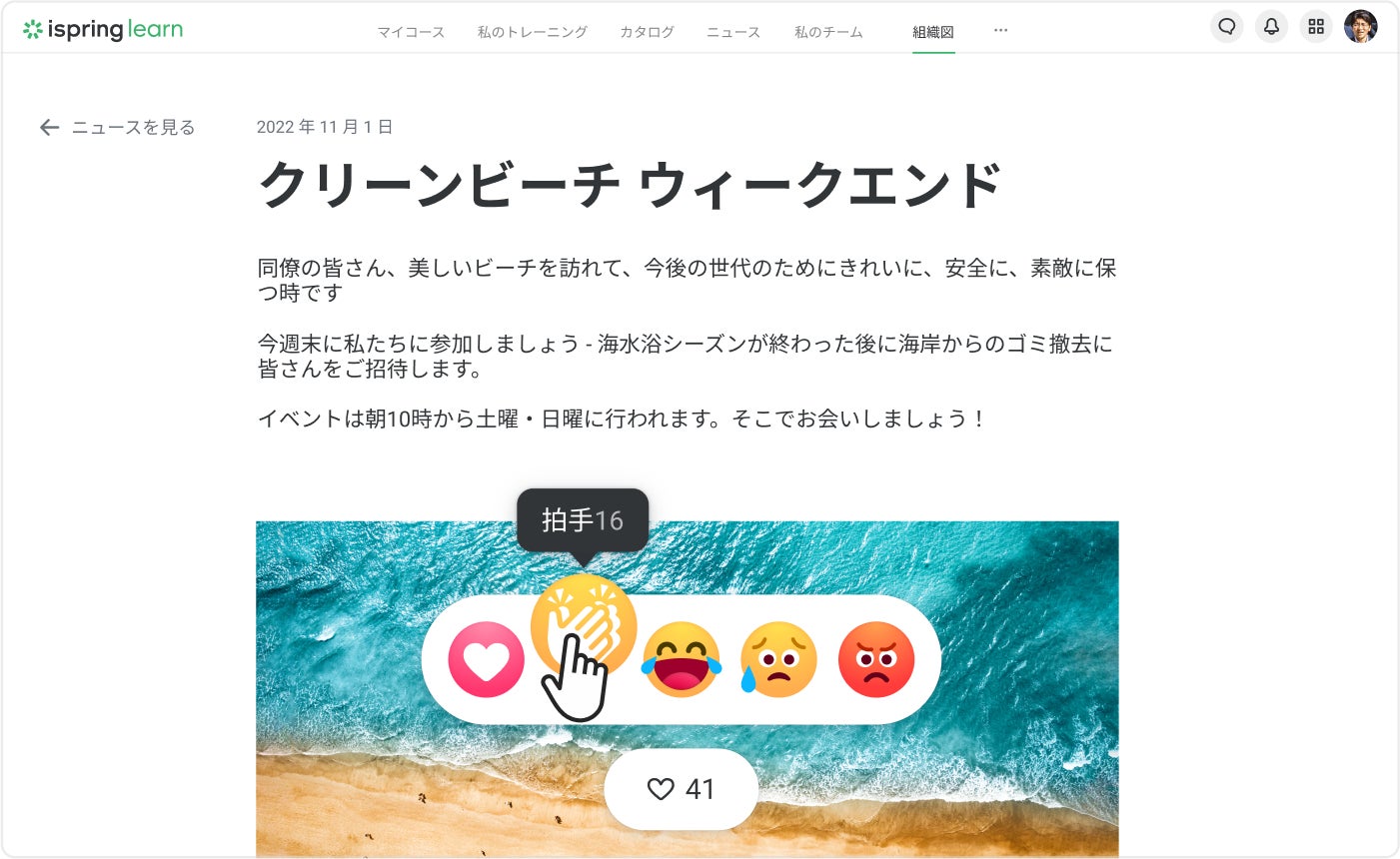 iSpring Learnの新機能と更新機能には、スーパーバイザー ダッシュボード/ファンクショナルスーパーバイザー ダッシュボード、インタラクティブな組織図、リアクション付きの企業ニュースフィード、改良版iSpring Learnカレンダーがあります。
