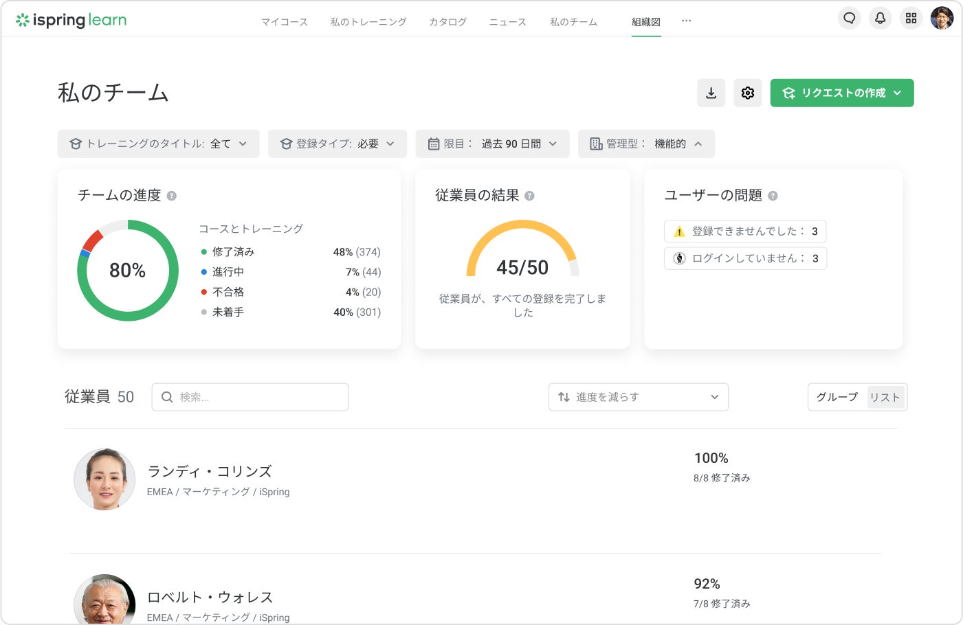 ファンクショナルスーパーバイザーはiSpring Learnの管理者の役割で、スーパーバイザー ダッシュボードへのアクセスが必要ながらも、恒久的なスーパーバイザーや部門マネージャーでない人にぴったりです。シフトスーパーバイザー、トレーナー、短期間研修を監視する必要があるその他の専門家などが挙げられます。この機能を使うと研修管理がさらに生産的、簡単、スマートになります。