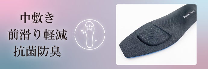 足がつま先へ動くのを防ぐ滑り止めがついた中敷きに、抗菌防臭加工をプラス。