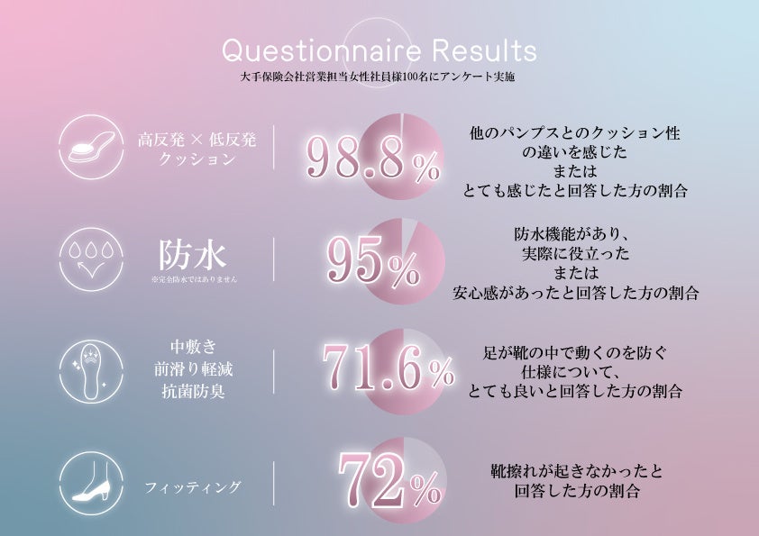 累計販売足数10万足越えを記録したマジカルステップスのリニューアルに伴い、パンプスを履いて活躍されている外回り業務の多い女性の代表として、大手保険会社営業担当100名様に2023年11月15日~11月30日の期間ご試着頂き、アンケートを実施しました。