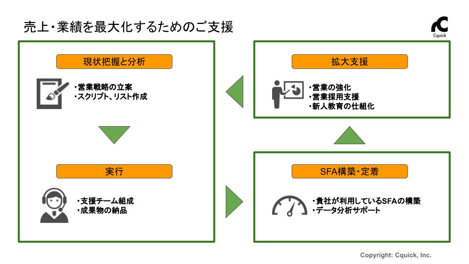 伴走型インサイドセールス事業を展開する株式会社Cquickは、営業戦略立案から実行までクライアントのインサイドセールスのトータルサポートサービスを提供いたします。