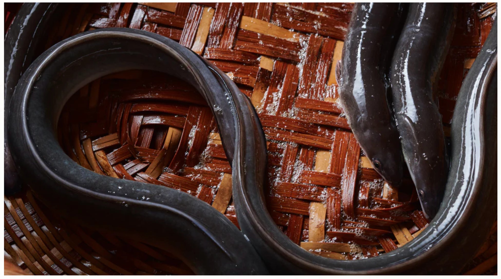 川魚(うなぎなど)は活きている状態でないと調理できないため、「活きたうなぎ」を毎日仕入れています。産地は主に、味・脂・色の優れた鹿児島産を使用していますが、他の産地がより優れている場合はその時の最良のものを仕入れます。仕入れたうなぎは熟練職人が選別し、地下130mの深さより汲み上げた清涼な地下水の生簀に入れることで鮮度を保っています。
