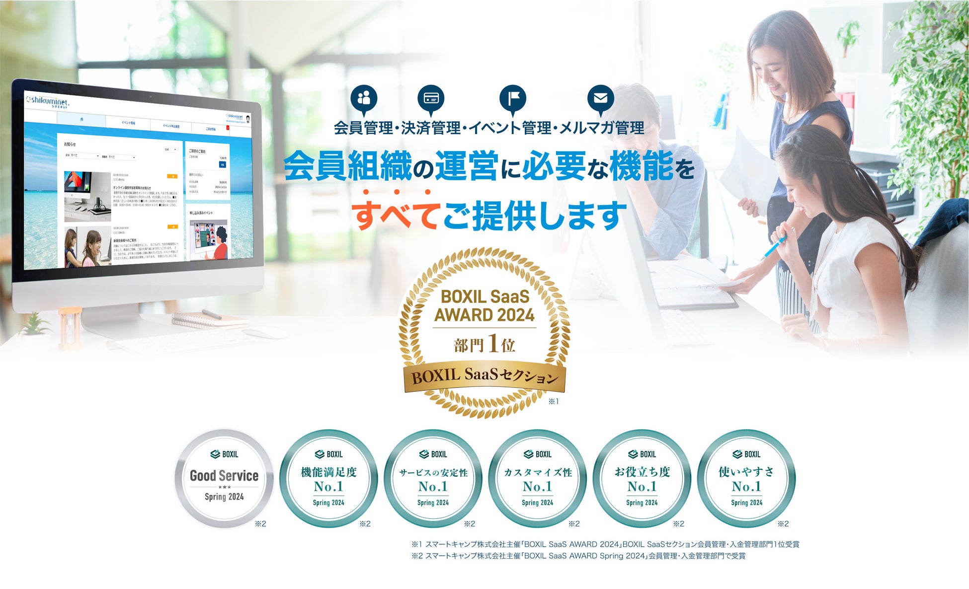 しゅくみねっと株式会社(本社:東京都目黒区、代表取締役:祝嶺光彦、以下「弊社」)が提供する「シクミネット」(https://shikuminet.com/)は、スマートキャンプ株式会社(以下「スマートキャンプ」)が主催する「BOXIL SaaS AWARD Autumn 2024」の会員管理・入金管理部門で「Good Service」「サービスの安定性No.1」「機能満足度No.1」「カスタマイズ性No.1」「お役立ち度No.1」「使いやすさNo.1」に選出されました。