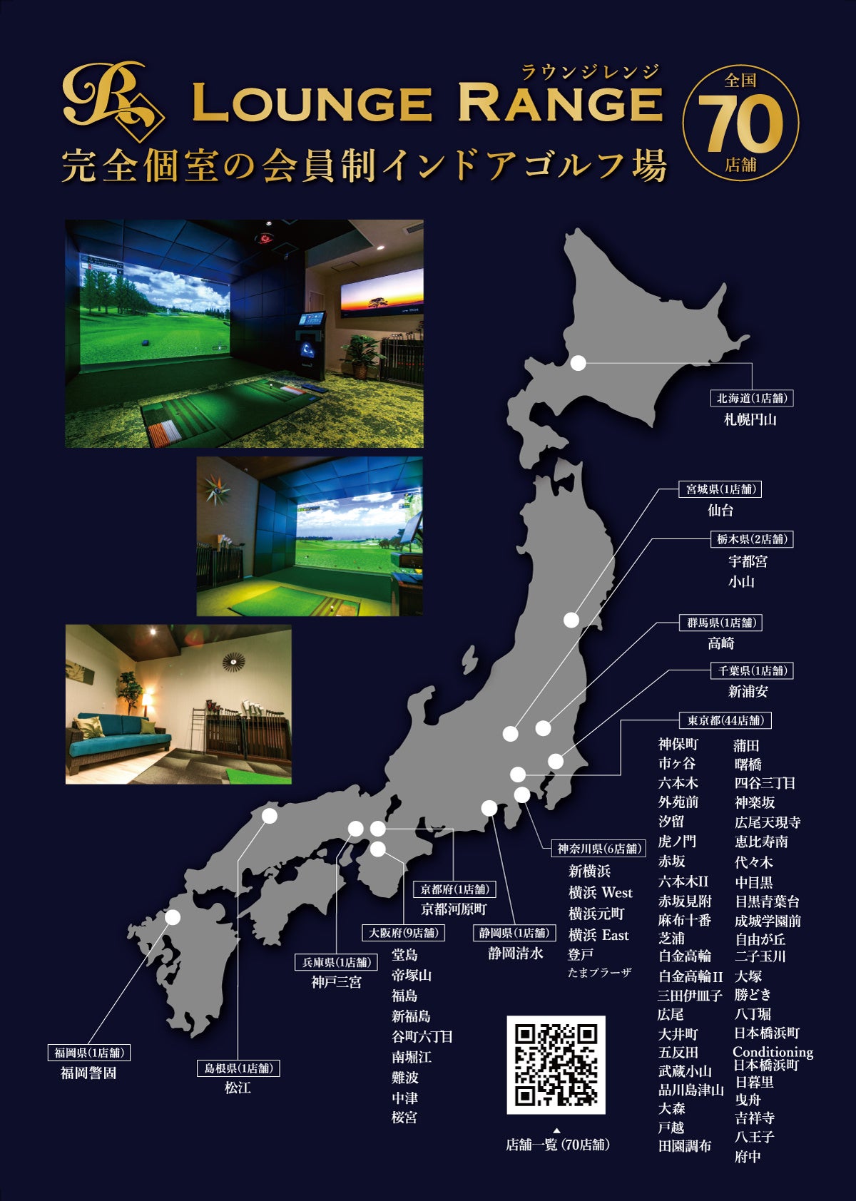 「新しいゴルフの楽しみ方」を提唱したコンセプトに共感・賛同いただいた結果、Lounge Range は、創業4年目で全国70店舗を達成いたしました。(2024年10月1日現在出店予定含む)