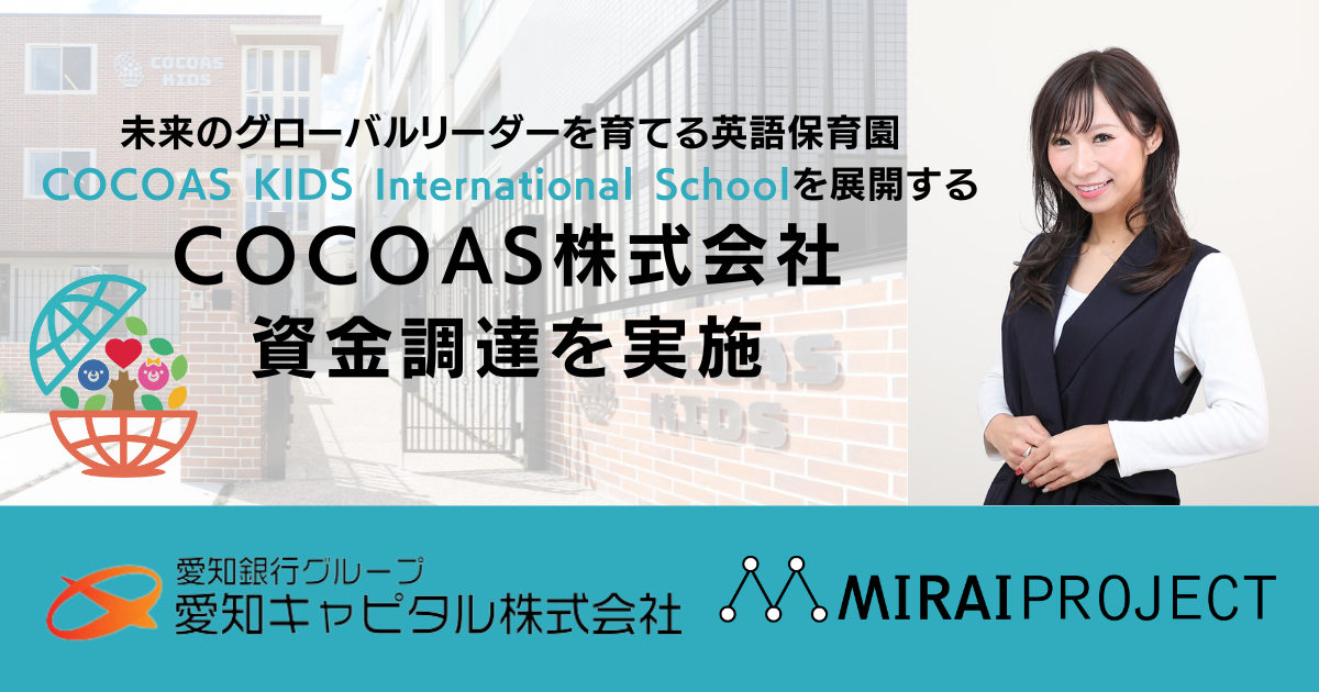 未来のグローバルリーダーを育てる英語保育園を運営するCOCOAS株式会社は、愛知キャピタル株式会社、株式会社ミライプロジェクトより約5000万円の資金調達を実施