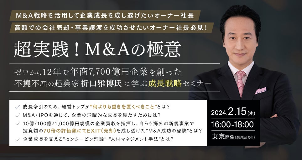 その中でも今回は特別に、著書では語り尽くせなかった”M&Aによる企業成長”に焦点を当て、どのように企業成長を牽引されてこられたかについて、買い手側・売り手側の両視点から語っていただきます。第1部は、折口氏の経験に裏打ちされた"実践的なM&A成功の秘訣”についての基調講演。第2部では、ビジネスオーナーEXIT支援の専門家、弊社代表末永との対談を通じて「2度のEXIT経験、中でも自ら海外の新規事業で成功を収めた上でのバイアウトについて」「どのようにして投資額の70倍のバリュエーションがつき売却することができたのか」など様々なテーマをさらに深堀りしてお伺いし、起業家・オーナー経営者へ向けたメッセージをいただきます。