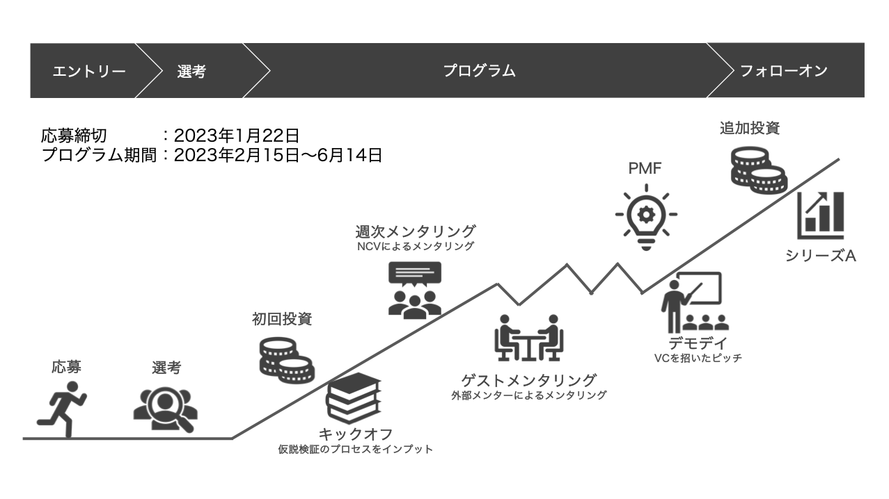 プログラムでは、PMFまでの仮説検証プロセスをレクチャーするキックオフを開催、その後、NVCメンターとの週次メンタリングを通じて、仮説検証を繰り返し、PMFを目指します。