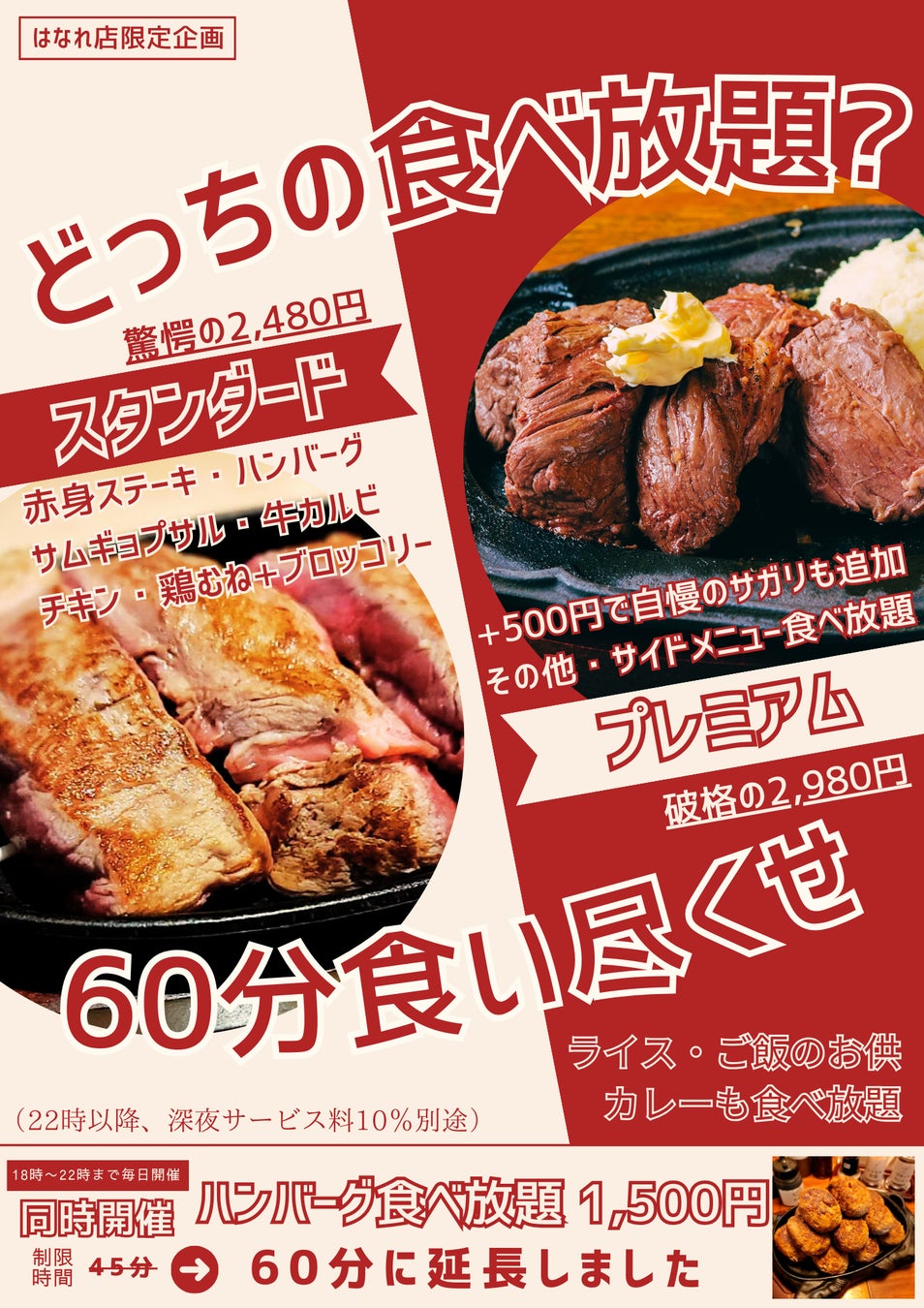 食べ放題に特化した『ハラペコステーキ新宿はなれ店』の食べ放題メニューがさらにお得にリニューアル、渋谷店で大人気の「ハンバーグ食べ放題」が新宿でも楽しめます。また、営業時間が18時〜翌6時から19時~翌8時へと変更。